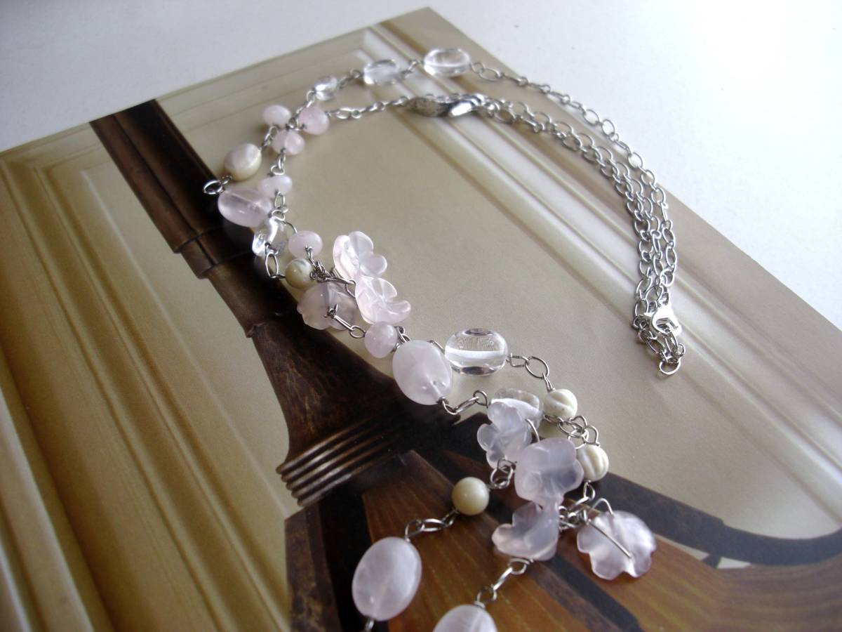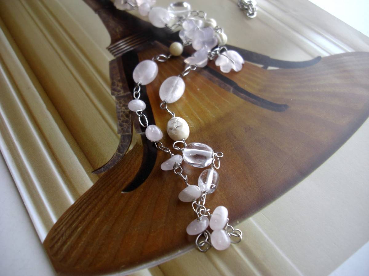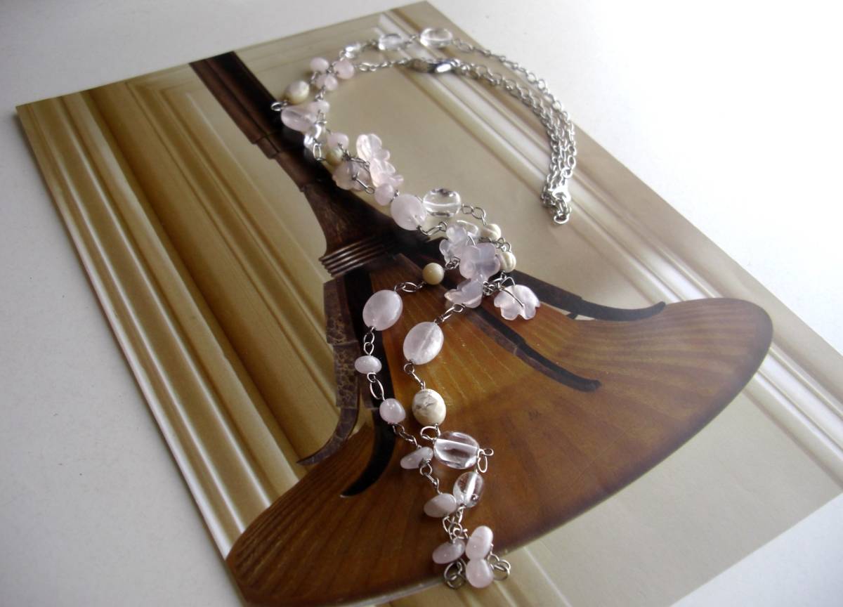 モンローの夢・・シリーズです♪水晶とローズクォーツと・・神秘的な水晶とローズクォーツのネックレスです♪9ミリから11ミリ位のタンブルの水晶にミニタンブルやオーバル、12ミリのお花のローズクォーツ、アフリカンオパールを合わせてロマンチックな表情です♪長 さは全長105センチ位で調節自由です♪長いので2連にされても素敵です♪お揃いのシリーズも出品しています♪長く着けていただけ るデザインを考えて作りまし た!ハンドメイドをご理解頂いてノークレーム、ノーリターンでお願いします