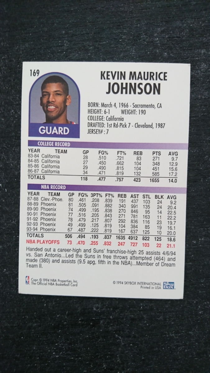 1994年にトレーディングカードを購入し手に入れたSKY BOX製NBA PHOENIX SUNS「KEVIN・JOHNSON」1枚です。