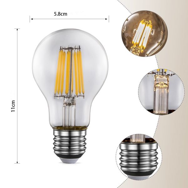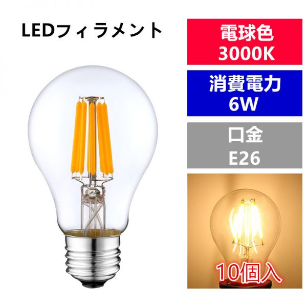 LED 電球フィラメント型E26口金 クリア広角360度エジソン球 6W 電球色A60(10個入り)