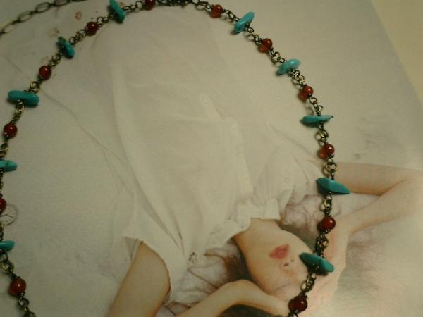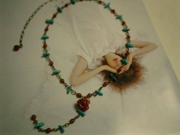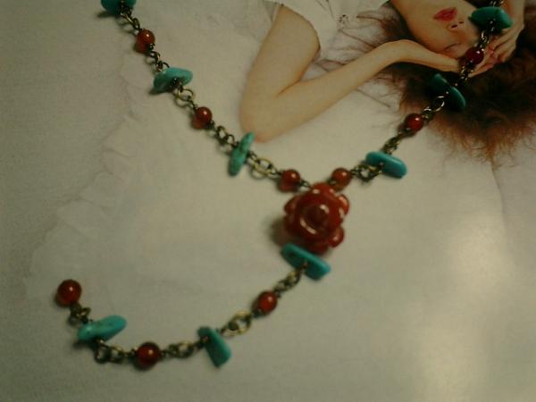 可憐で繊細な雰囲気のターコイズとカーネリアンのラリエット風のネックレスです♪ターコイズはさざれでカーネリアンは4ミリの丸玉です♪トップはカーネリアンの15ミリの薔薇です♪これからの季節にぴったりの爽やかで可愛いネックレスです♪長さは全長55センチ位で調節出来ます♪トップは7センチ位です♪お揃いのブレスレットも出品予定です。ハンドメイドをご理解頂いてノークレーム、ノーリターンでお願いします。