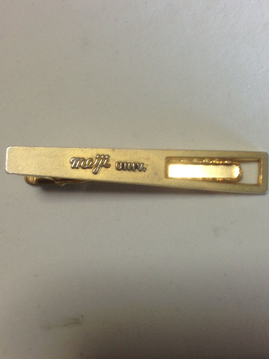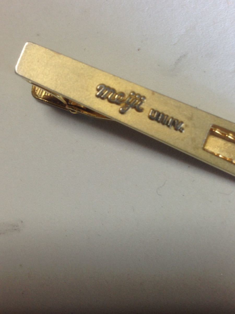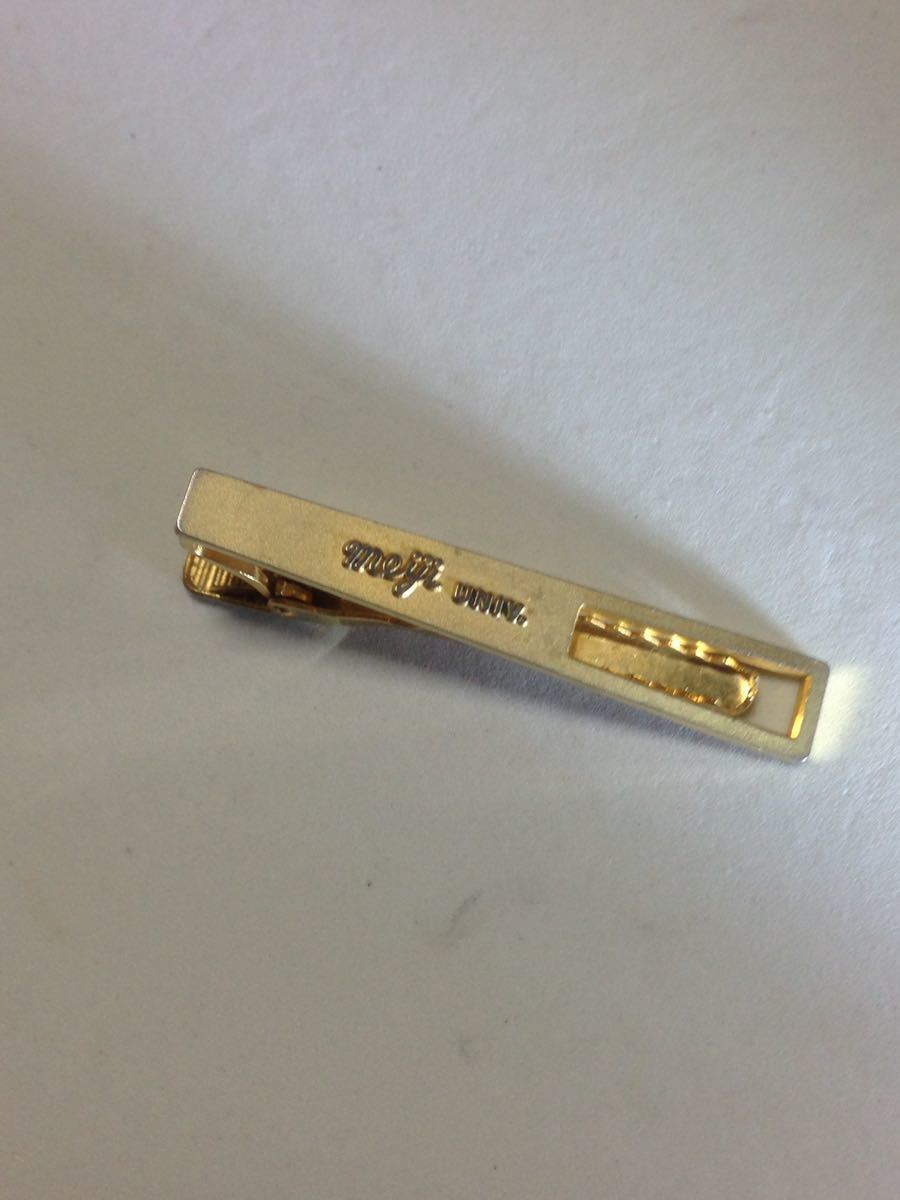 明治KKのタイピンです状態は汚れはありますが、傷などは一切ありません、サイズは8×50ミリ、ゴールドカラーのタイピンです、裏側には体育大会表彰と明記されています