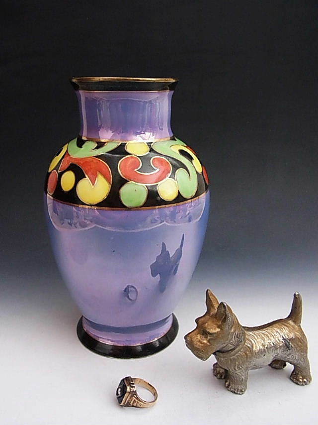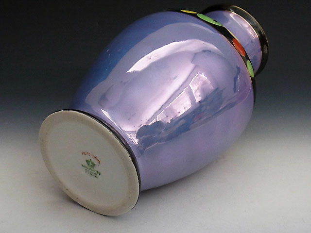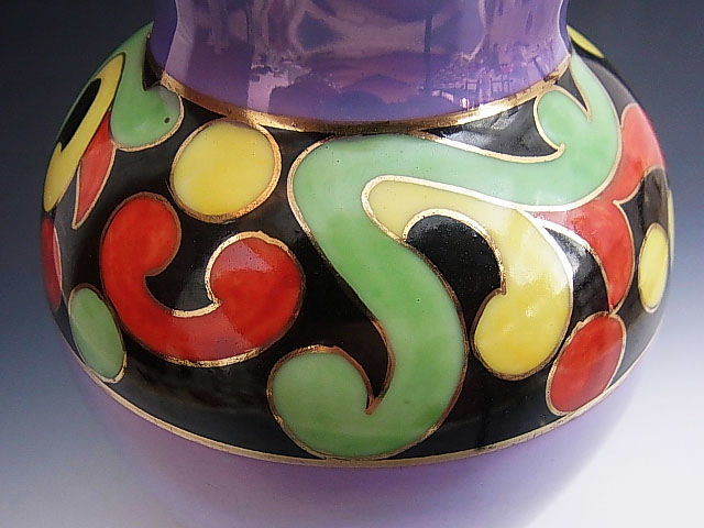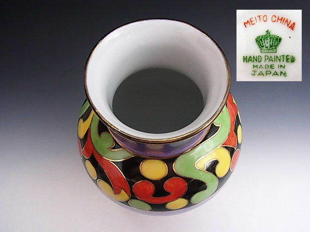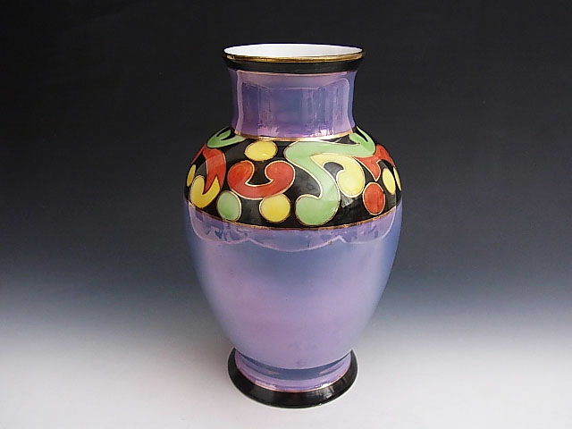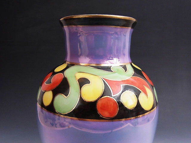 当時旺盛な米国向け輸出を補うような役割を担ったノリタケのライバル、名古屋製陶所の花瓶です。 シンプルなブルーラスター彩に3色で軽やかなアールデコ文様を描いた見飽きることの無い作品です。 状態はほぼ完全美品です。 年代は大正後期の米国向け作品です。 大きさは口の直径が6cm、全高が17.5cm あります。 送料は2800円頂きます。 お支払いはYahoo!かんたん決済、または銀行振込みでお願いします。 日本以外への海外発送も承ります。 ご入金確認後支払2日以内にアメリカより航空便でお送りいたします。 発送後通常4~10日でお届けいたします。 複数品落札の場合は送料をまとめて計算させて頂きますのでお得になります。 私共は経済産業省の定める特定商取引法を順守しております。 当方の所在地住所等は出品者の自己紹介情報欄をご覧ください。 ご質問等ございましたらお気軽にお問い合わせください。   他にもオールドノリタケを中心に沢山出品しておりますのでここをクリックしてご覧ください。