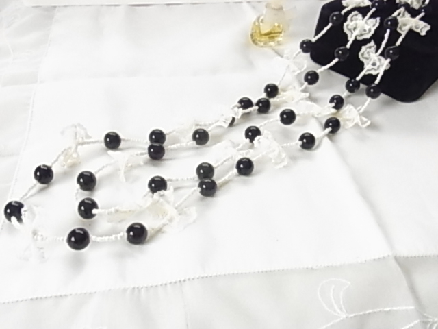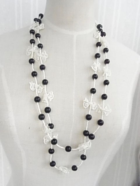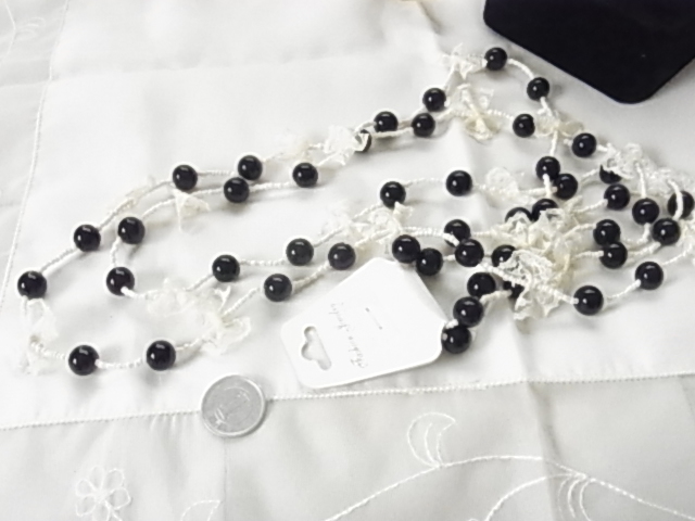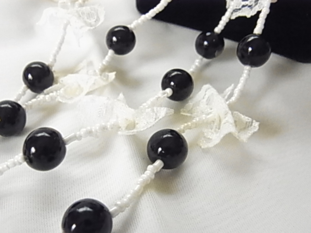 新品未使用 タグ付き 黒と白のモノトーンデザイン ビーズとレースのリボンが可愛い ロング2連ネックレス◆◆