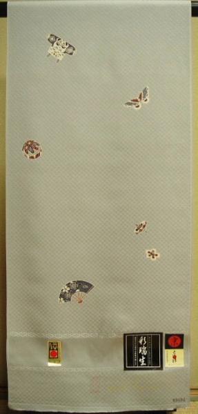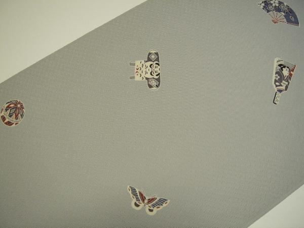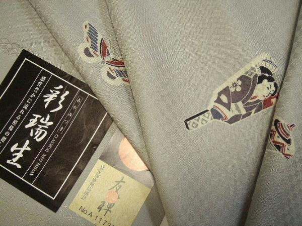 ≪経済産業大臣指定 伝統的工芸品≫ シワになりにくい上質の、丹後産ちりめん紋意匠(5mm角の市松地紋)の生地を使用し、灰色の地色に、『彩瑞生』と題し、【凧】【毬】【独楽】【蝶々】【扇面】【羽子板】等の縁起物を染めた「おしゃれ飛び柄・京友禅小紋」です。 生地長:三丈六尺強 生地巾:一尺(38cm) ※希望落札価格で落札頂けますと、防水・防汚加工を無料でサービスさせていただきます。