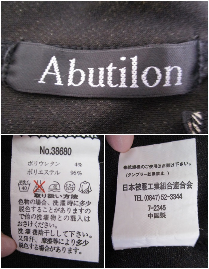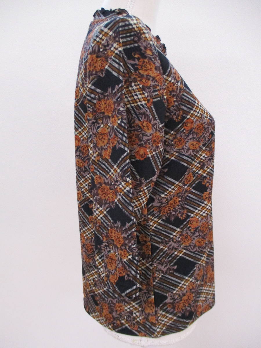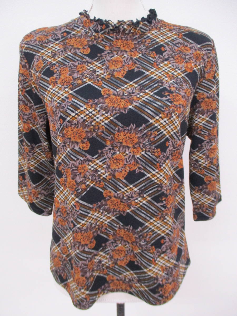 △279【送料無料】Abutilon トップス 七分袖カットソー モックネック M相当 ブラック×オレンジ チェック 花柄 二重襟 ストレッチ 肩パッド