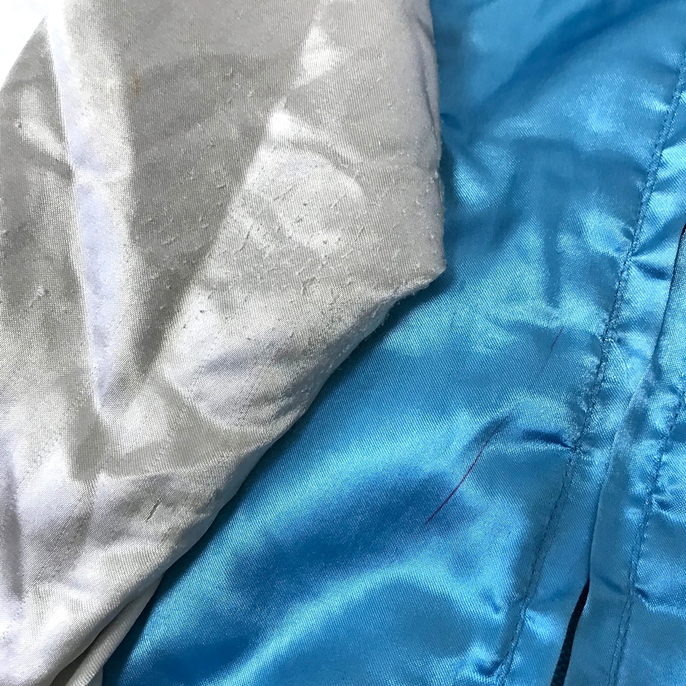 薄いくすみ、フロントに薄いペン汚れ、袖のスレなど若干の使用感ありますが着用には問題ありません
