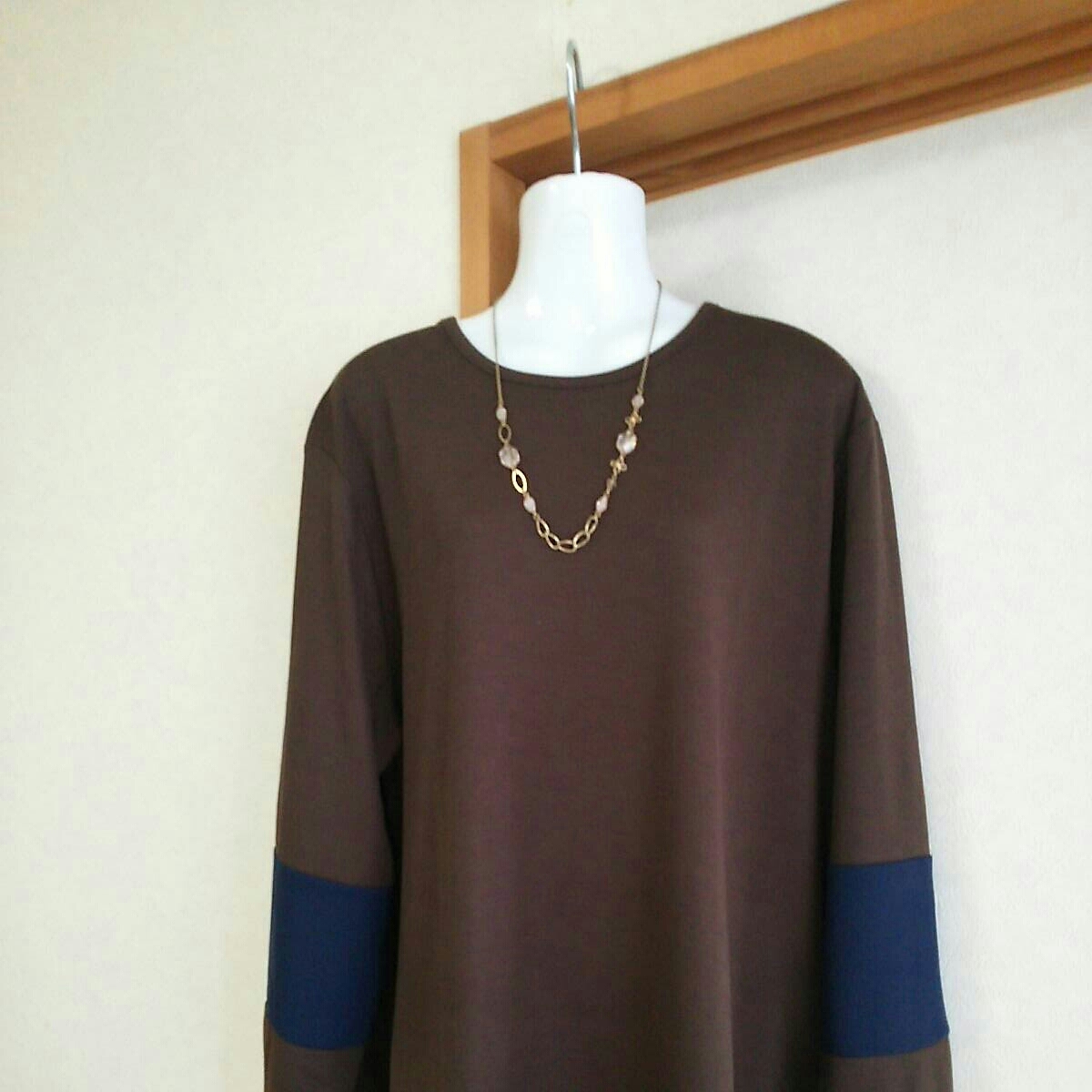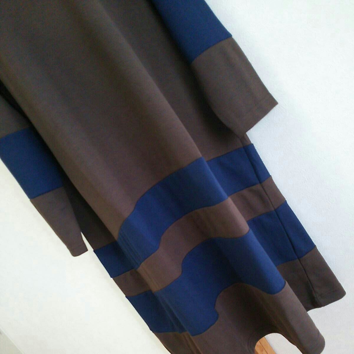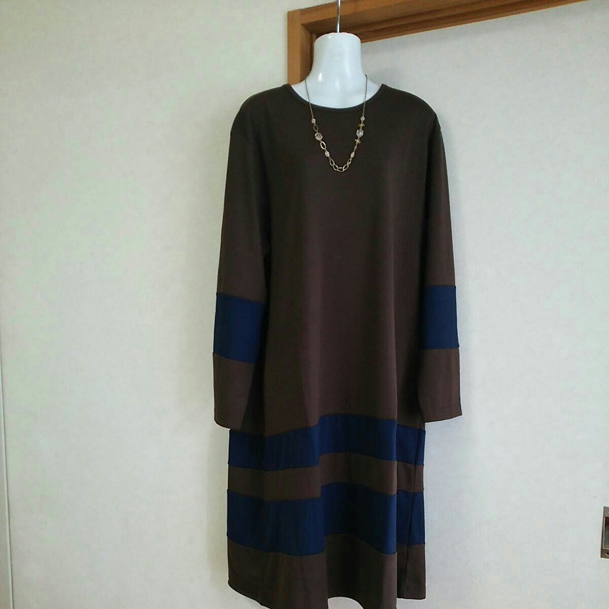 こげ茶に紺の太い線が、とても上品で素敵なワンピースです。。サイズは4L になります。バスト107~115、丈104センチです。素材はポリエステル100%です。柔らかい素材で着心地もいいと思います。