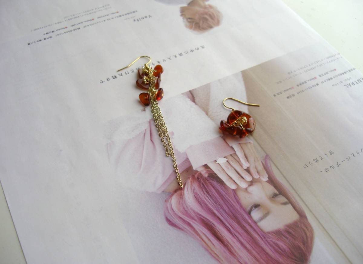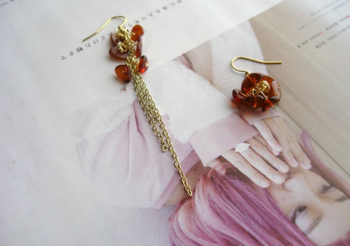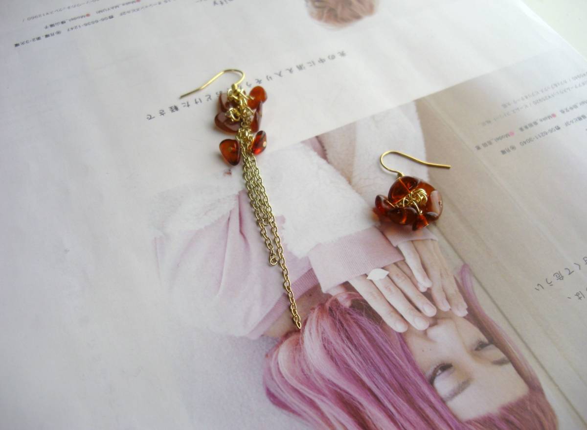 乙女の時間・・シリーズです♪琥珀を紡いで・・シックな琥珀のピアスです♪デザイン違いの2本セットです♪華奢なチェーンを合わせて甘すぎない大人の表情です♪ 琥珀は4ミリから8ミリ位までのミニタンブルです♪長さは長い方が9センチ位、短い方が3センチ位です♪ご希望でお揃いのデザインでもお作り出来ます♪イヤリングにも変更可能です♪お揃いのネックレスやブレスレットも出品しています♪シンプルで飽きのこないいつまでも着けられるデザインを考えて作りました!ハンドメイドをご理解頂いてノークレーム、ノーリターンでお願いします