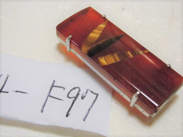 レンガ色の石に笹柄の虎目石をはめ込んだ帯留です