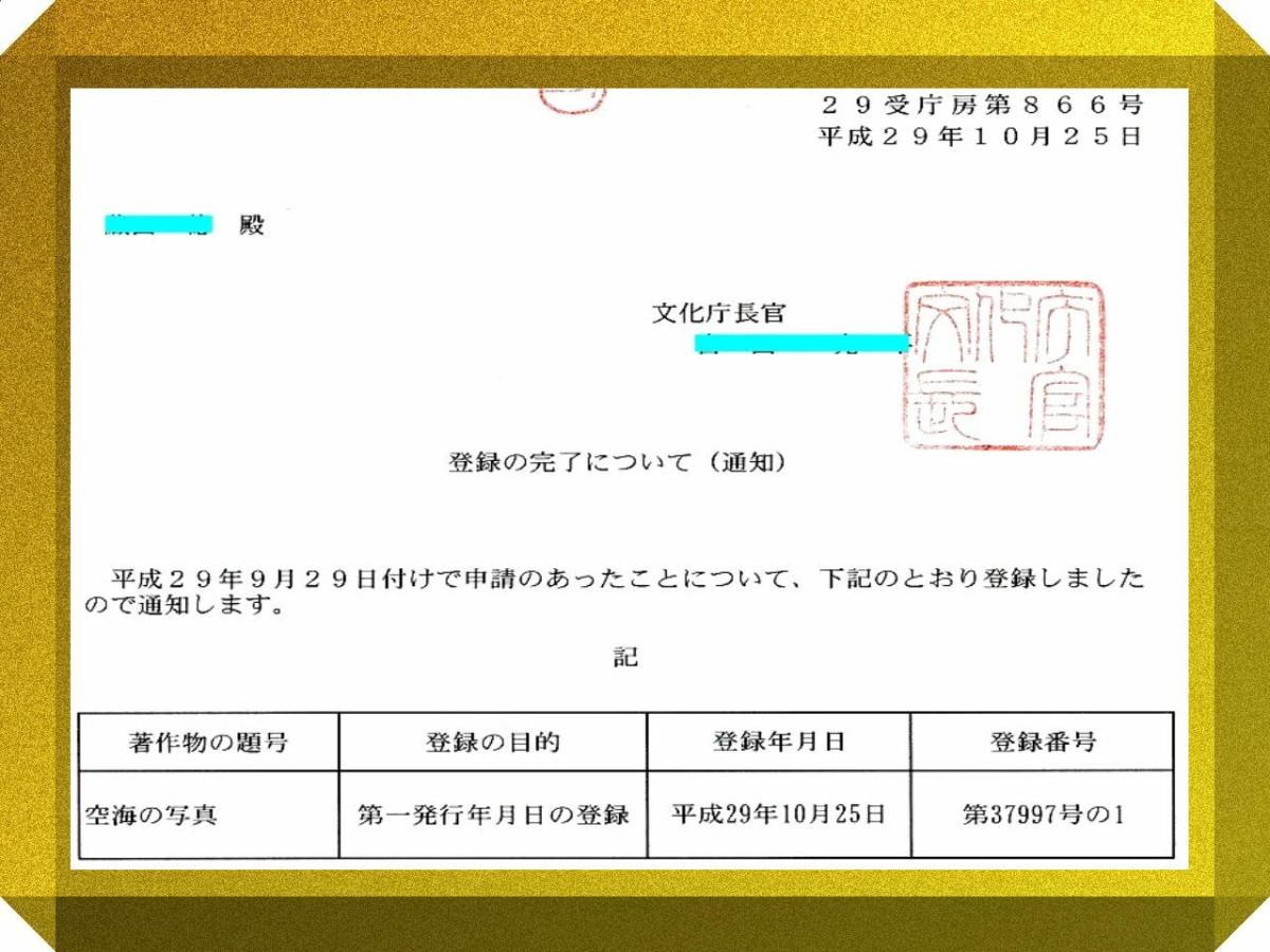商品の紹介 | ◆この商品につきましては、入札、落札に決まり、制限があります。尚、お支払いは下記項目の①と②が完了後となります。①と②はかんたん決済支払い期限内で行う必要がございます。 落札にあたり、落札後に当方が要求するものに対応出来る方のみの、入札とさせて頂きます、人物確認に必要なもの二点を当方へ郵送となります。 ①落札後当方への運転免許証二倍の拡大カラーコピー ②住民票一通 ①②の目的は写真所持者管理の為のもの、一般公開・複製に至った場合に明白にする目的内容のものです。 空海の写真を落札後の扱いは、落札者による一般公開・複製は出来ません。 (著作権の法律)日本国文化庁への著作物の登録済みの法的効力は、日本国内の範囲だけでは御座いません。 文化庁への登録内容である、「空海が写り込んでいる写真」と「題号」である(空海の写真)は当方の許可なくして、使用不可能です。 お渡しするもの三点「カメラで撮った際に写りこんだ写真ことで、空海像の写真のことではありません。」 Lサイズ写真(一枚) B5拡大カラーコピーを額に納めたもの(一つ) 文化庁登録申請受理、登録完了を示す用紙の複製紙(一枚) 写真表面には、印押し、管理番号表示といたします。 出品写真は空海の生前の像で一部分をお見せいたします。入札、落札の写真とは無関係のものです。水銀入れ,五鈷。 ■ノークレーム&ノーリターン品です。 ■自己責任において入札をお願いいたします。 【発送内容】 支払い完了済み後:1日~7日間での発送となります。 |