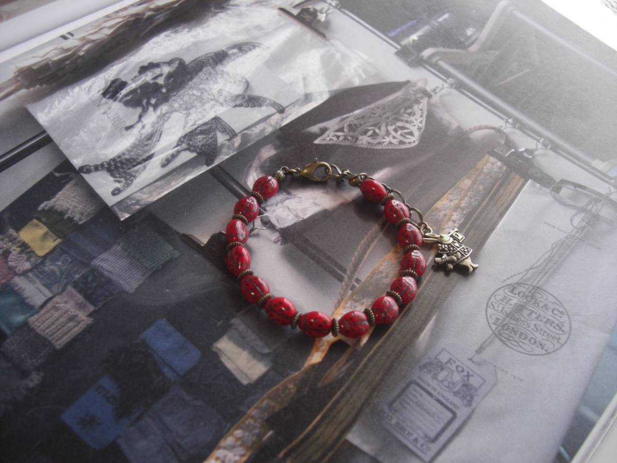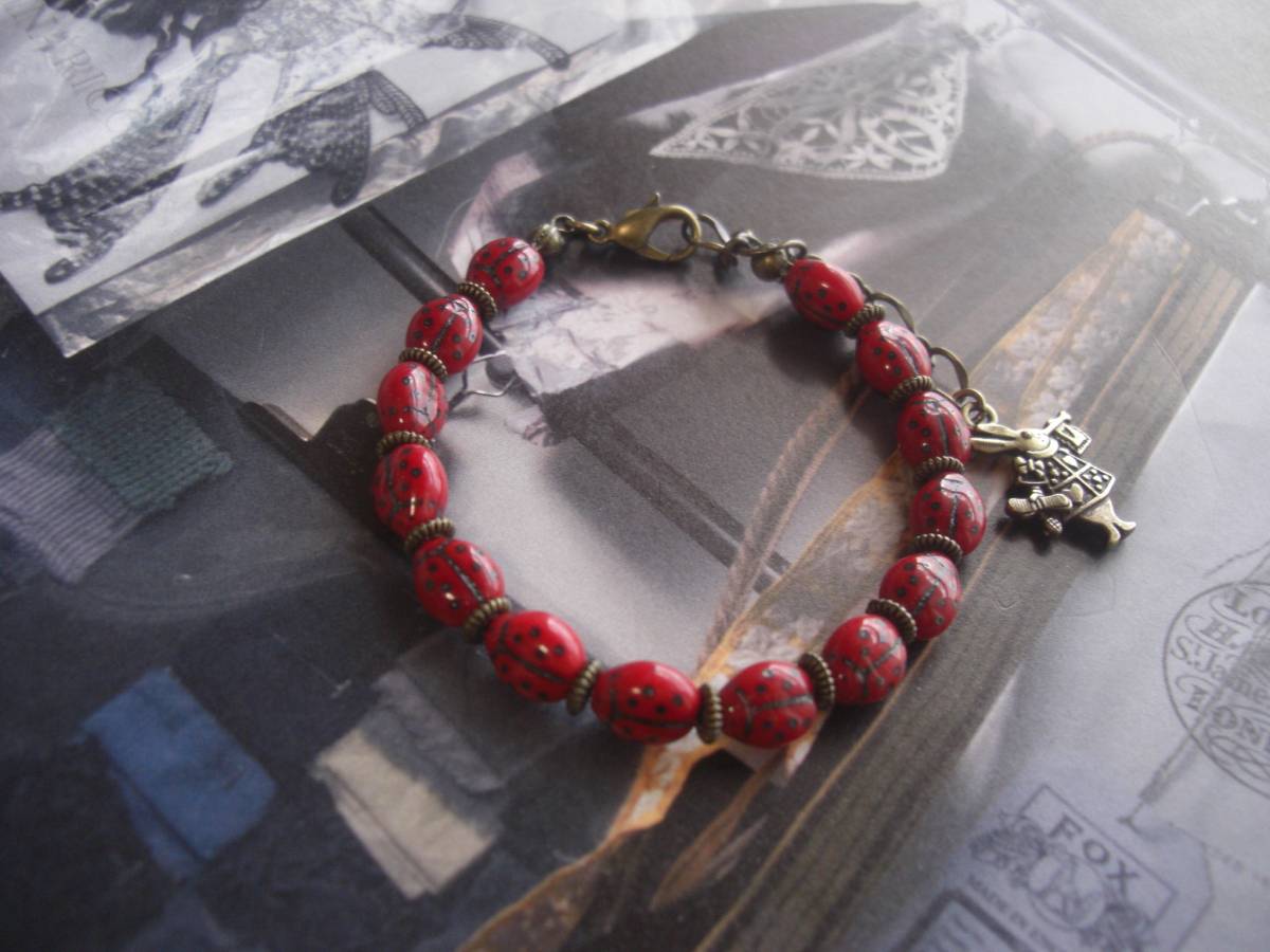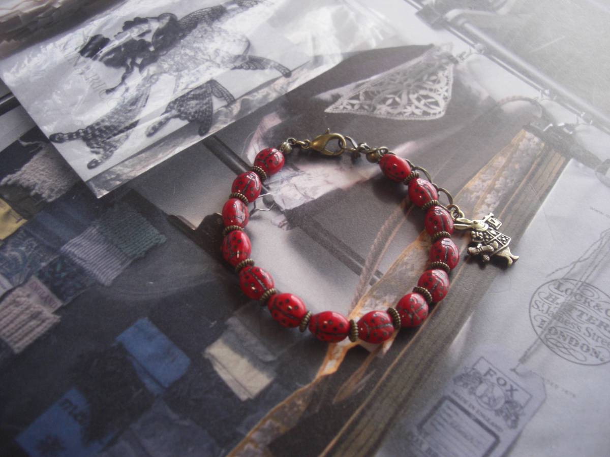 パンクを+して・・シリーズです♪魔法の言葉・・可愛いてんとう虫のブレスレットです♪シックなメタルチャームを合わせてアンティークな雰囲気です ♪チェコのてんとう虫は9×6ミリ位です♪深い赤がキュートです♪長さは16センチ+アジャスター 6センチで最長センチ22センチ位です♪お揃いのネックレスやピアスも出品しています♪♪シンプルで長く着けていただけるデザイ ンを考えて作りました♪ハンドメイドをご理解頂いてノークレーム、ノーリターンでお願いします