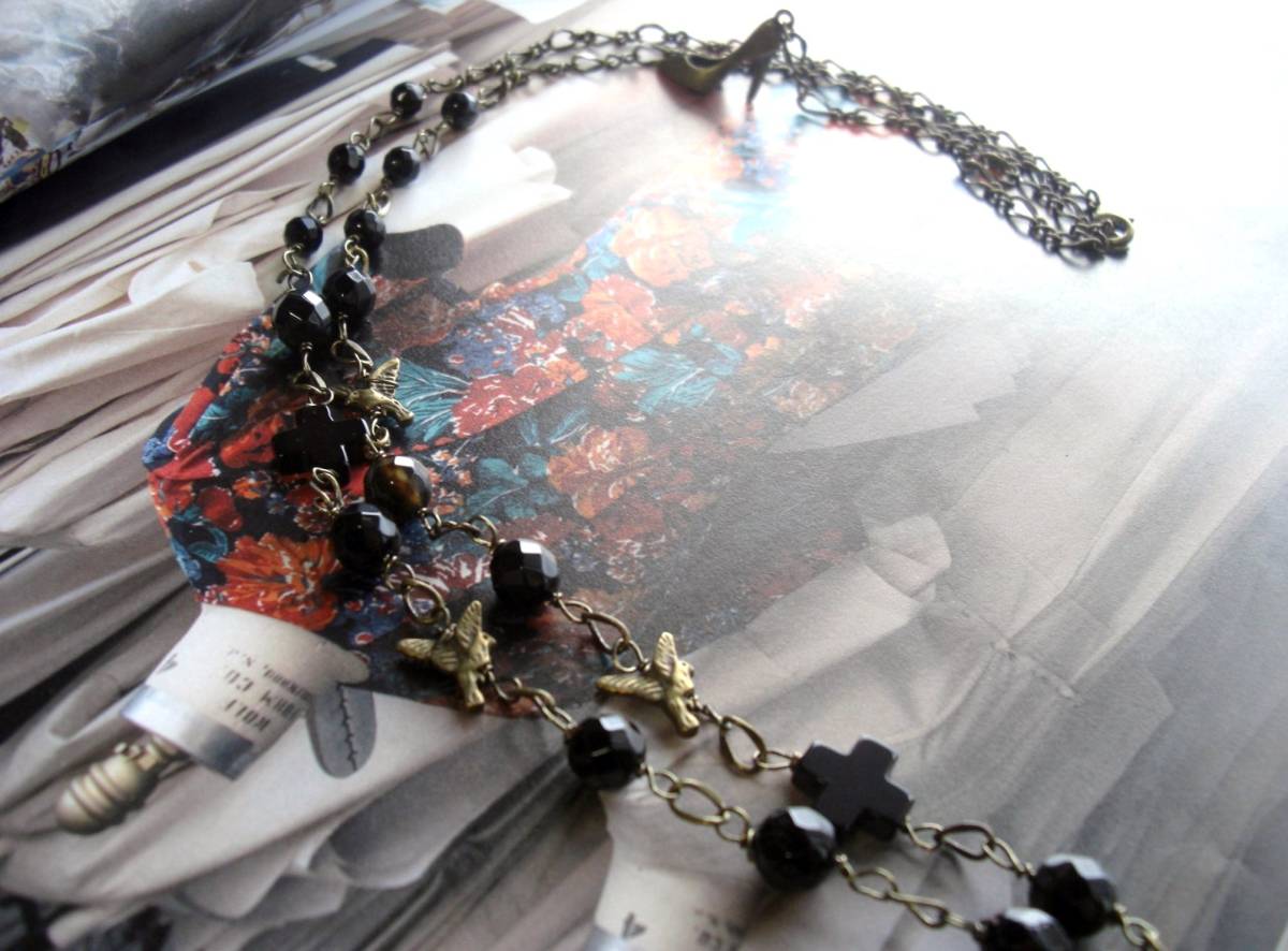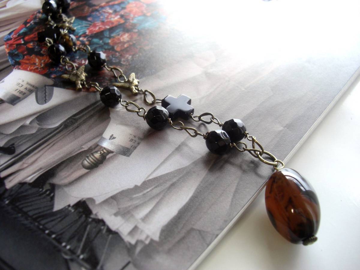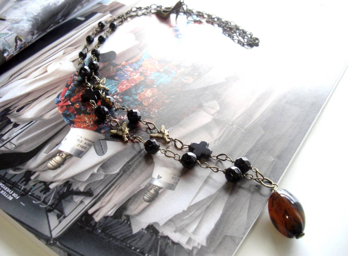 パンクを+して・・シリーズです♪オニキスと小鳥さんと・・シックなオニキスとアンティーク・バンデッド・アゲートのネックレスです♪6ミリから12ミリ位までのランダムカットやクロスなどデザイン違いのオニキスにコニャック色のバンデッド・アゲートがニューヨーク・モダンしています♪小鳥さんのメタルチャームを合わせて大人可愛い表情です♪長さは全長85センチ位で調節自由です♪チョーカー風にされても素敵です♪トップのバンデッド・アゲートは23×15ミリ位です ♪お揃いのブレスレットやイヤリングも出品しています♪ハ ンドメイドをご理解頂いてノークレーム、ノーリターンでお願いします