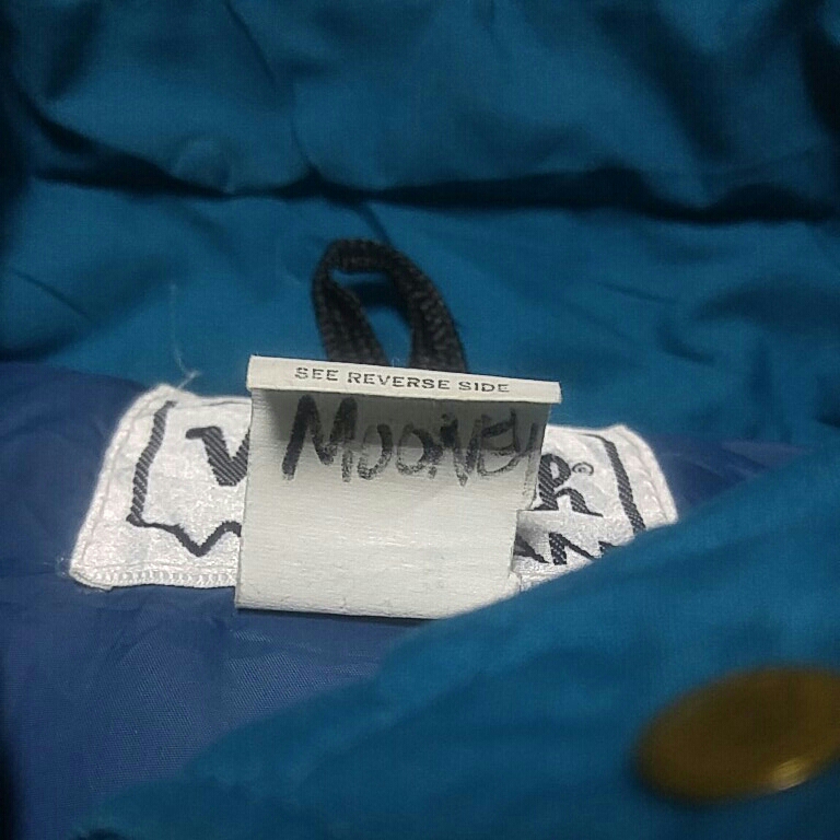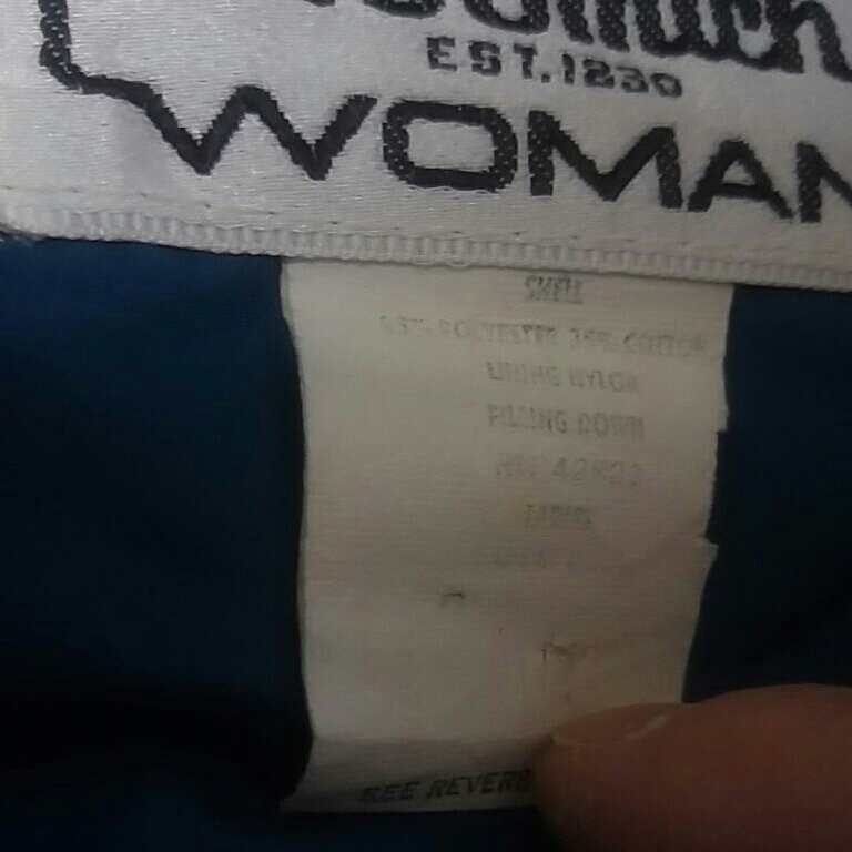 アメリカ製、ポリエステル65%綿35%、中身はダウン(割合は見記載)、腹部ポケットはYKK zip式。
