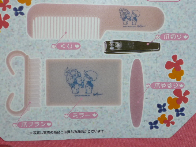 ☆商品説明☆ご覧いただきありがとうございます^^ 水森亜土キャラクター 非売品の亜土ちゃんのおしゃれセットです。2000年製。ポーチ、くし、爪切り、爪やすり、爪ブラシ、ミラーのセットです。亜土ちゃんキャラクターの絵柄でと~ってもかわいいですよ^^ ポーチの大きさはタテ 約11.5cm、ヨコ 約14.5cm、底幅 約3cmです。たいへん古いものですが袋に入れたままコレクション用として大切に保管していましたので新品、未使用でたいへんきれいな状態ですが家庭での保管ですのでご理解いただける方のご入札をお願い致します。 ☆発送方法☆ 定形外郵便、ゆうぱっく ☆コメント☆ ノークレーム、ノーリターンでお願いします。ご不明な点がございましたらお気軽にお問合わせ下さい。他にもキャラクターグッズたくさん出品しております☆ 良かったらご覧下さいね*^^*