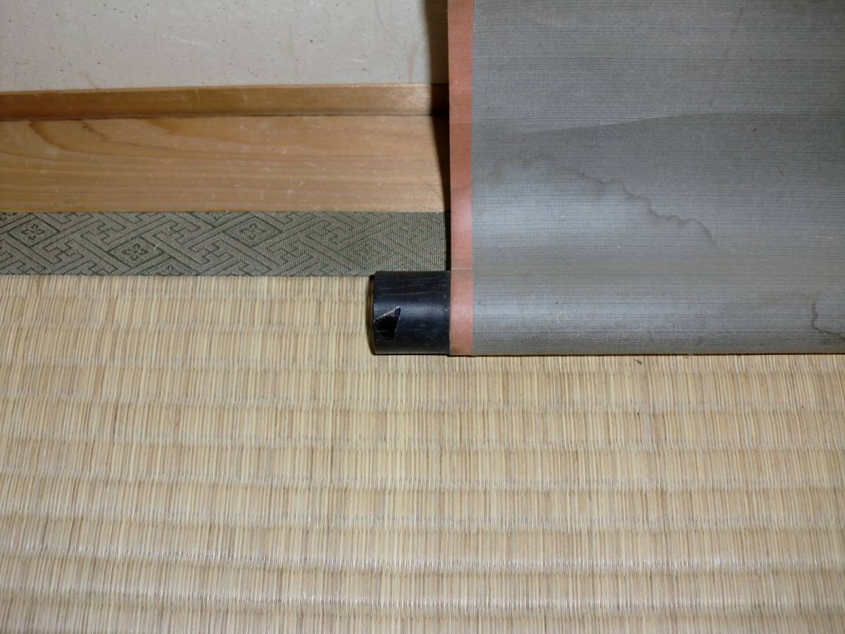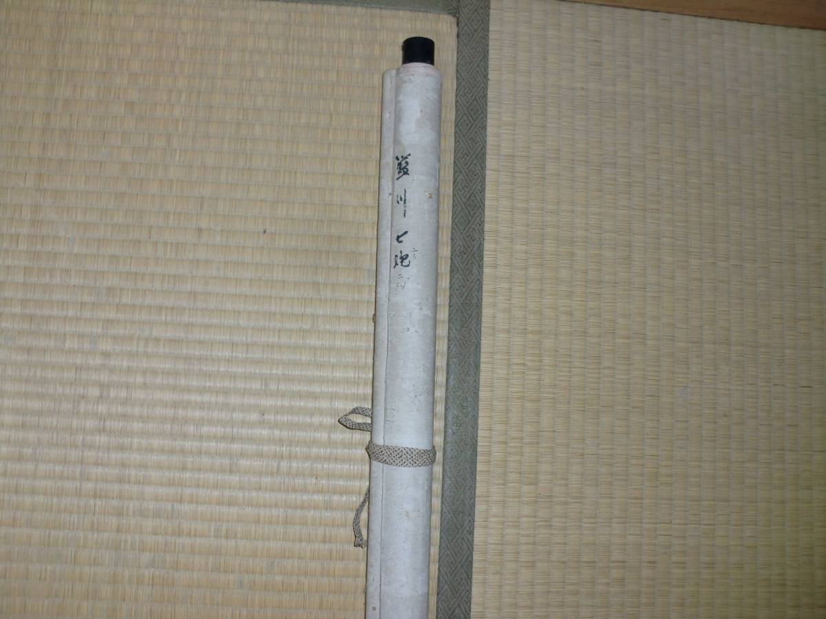紙本、表装 紙、軸先 木(片方欠損) 。