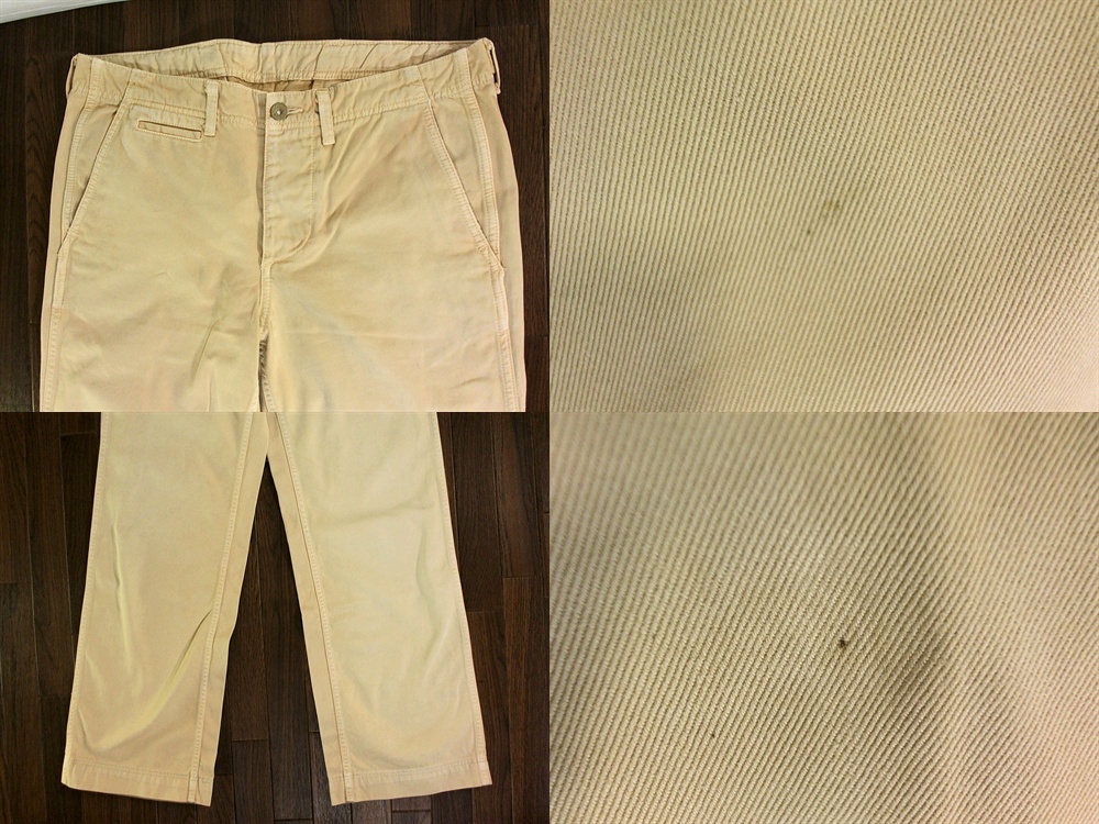 | 商品説明 | アバクロ、ホリスター、エアロポステールetcアメリカ、ハワイ現地買い付けピックアップ情報。お休み情報等のお知らせもしております。自己紹介と共に確認頂けると幸いです。 ご覧頂ありがとうございます。 素材タグが見当たらず詳細不明ですが、恐らく綿素材ツイルで、元々黄土色系だったものを、 ベージュっぽくなるまで色落ちさせた感じです。 なかなか趣の有る色合いです。。 ボタンフライ。 こちらの商品は中古商品に成ります。 上記通り色落ちが有り、履き込んだ使用感が有ります。 微かな物ですが、所々細かいシミ汚れが多数あります。。 その他は、目立ったシミ、ダメージは見当たりませんでした。 [表示サイズ] L [カラー] 画像をご認願います。 [素材表示] 綿100% [実寸平置きサイズ] W:44 H:51 わたり:29 股上:26 股下:74 裾:24 ※首廻りも2ツ折にして平置き計測です。2倍にしておおよその首廻りです。 ※単位は全てcmです。 ※素人計測につき、多少の誤差はご容赦ください。 [原産国] 中国 1階なんでも有りのお宝コーナー。是非ご覧ください。 2解ジーンズ、デニム専用コーナー 3階ジャケット、コート、秋冬向けパンツetc 4階アクセサリー、小物コーナー |