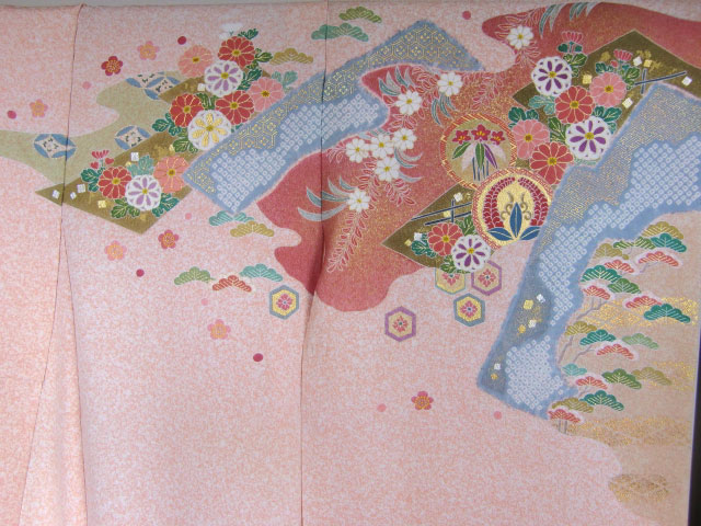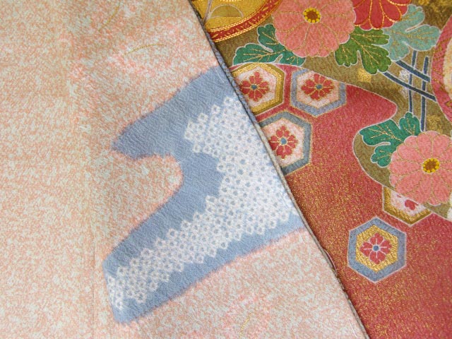 ◆ 左襟元の柄。 ピンクのたたきに豪華な金箔入りの柄が、胸元から衿にかけて続いている。