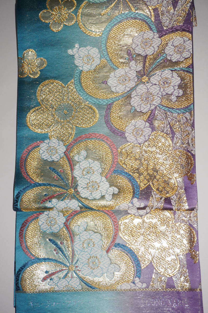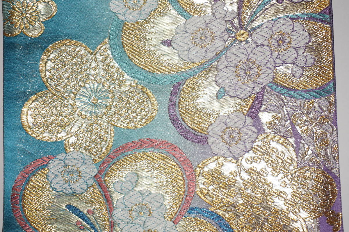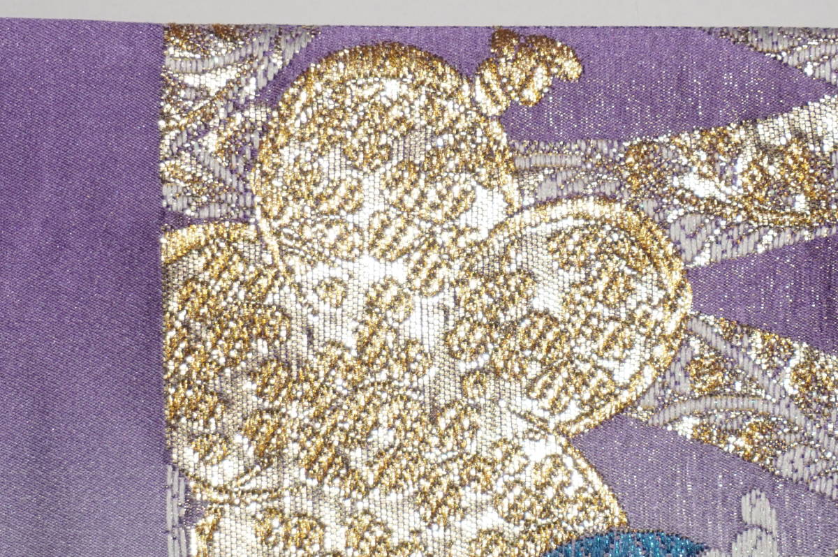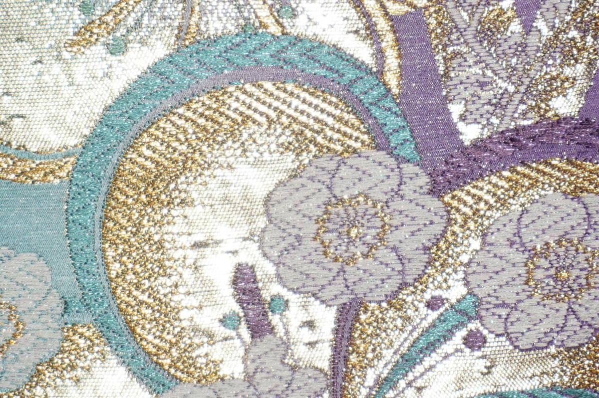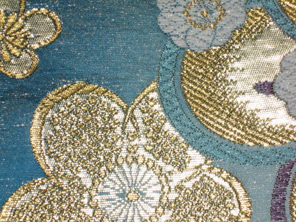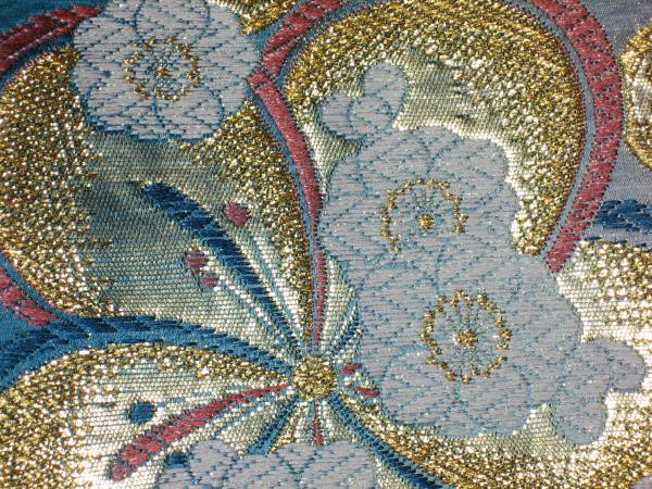 なお、帯柄左上に無地で出ているところは裏無地で、柄と柄の間に出ているところは手先と前太鼓のあいだの無地部分です。六通柄です。金銀糸が多用されているためストロボの照りで、しろぽく写っている部分があります