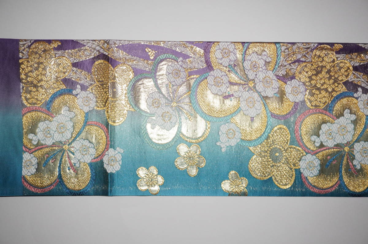 青緑~薄暗め紫地(裏地は黒)「かいきり(たれ先柄立ち上がり)~かいきり(手先柄はし)まで約450,5cmですので、出来上がり予想は約447cmです。巾30,9cm