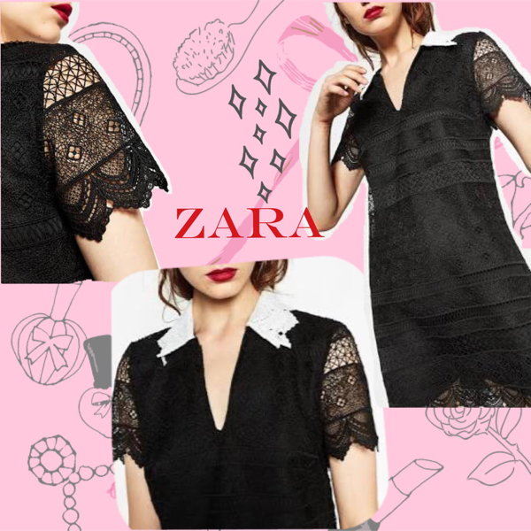 繊細なクロシェットレースのブラックミニドレス。レースの白襟が清楚な印象。有名メゾンのコレクションのような高級感あり。トレンドのサマーモノトーンコーデにも。