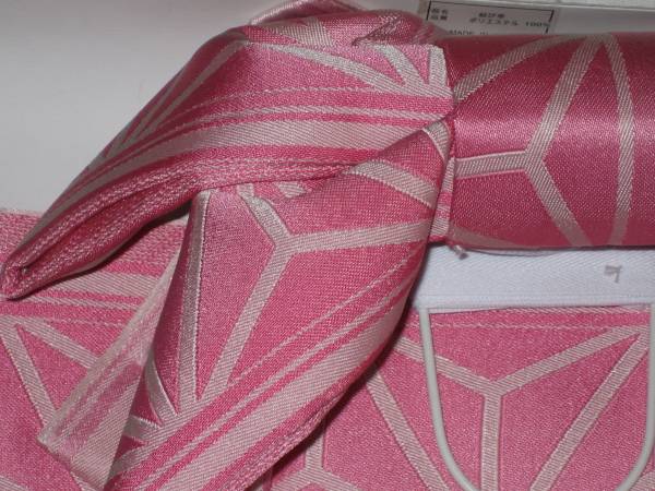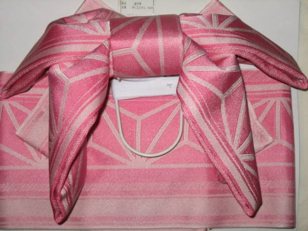 女性yukata用、地紋柄結び帯  ピンクぼかし  ポリエステル  新品(織り地紋柄ありです。波状の写りはレンズの光学的ないたずらで現品にはありません、また薄く濃く写っている場合もあります)、胴部--帯巾約16,5cmx長さ約130cm、リボン部は横に約30cm。見た範囲で汚れないと思いますが、着用に差し支えない薄汚れ(多分ない?)はあってものお値段で出品です。