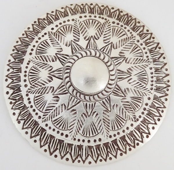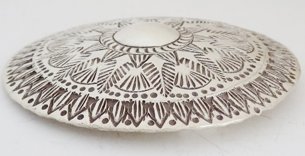 タイ北部に住む山岳民族カレン族のシルバーパーツです。 カレン族シルバーの純度は非常に高く、1つ1つがハンドメイドで丁寧に作られており、個性的なデザインが特徴です。 神秘的なデザインのパーツはネックレス、ペンダントのトップなど様々な用途にお使いいただけます。 刻印が大変美しく、芸術品のようです。 ●全体の大きさ:約5.2cm×5.2cm |