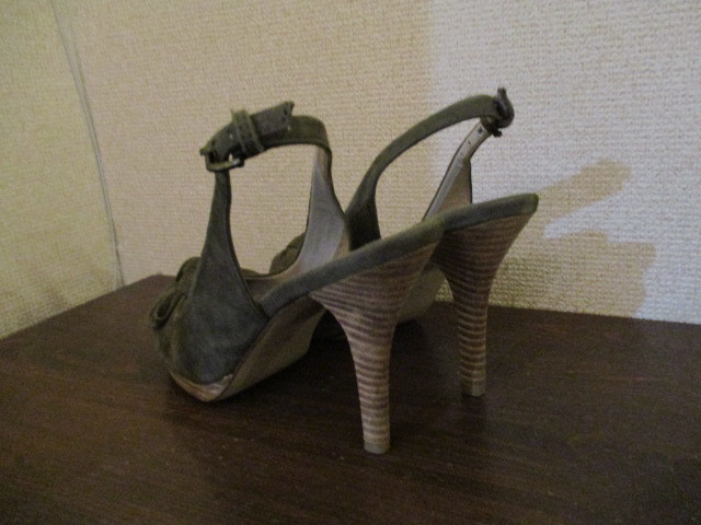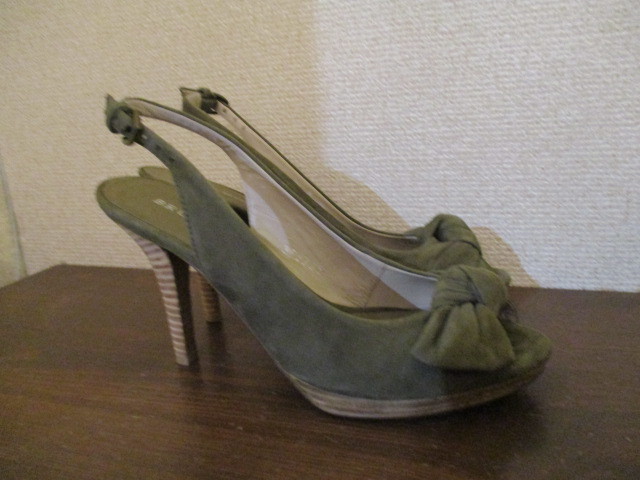 | 商品紹介 | モスグリーンカラーの牛革スエード素材のパンプスです。 足の甲部分のリボン飾りがアクセントになっています。 内側のベージュ部分も革で、ヒールは木製です。 発送方法 箱付きと箱なしで送料が異なります。 *一番安い送料 ・レターパックプラス(¥510)*箱なし ・定形外¥700*箱付き |