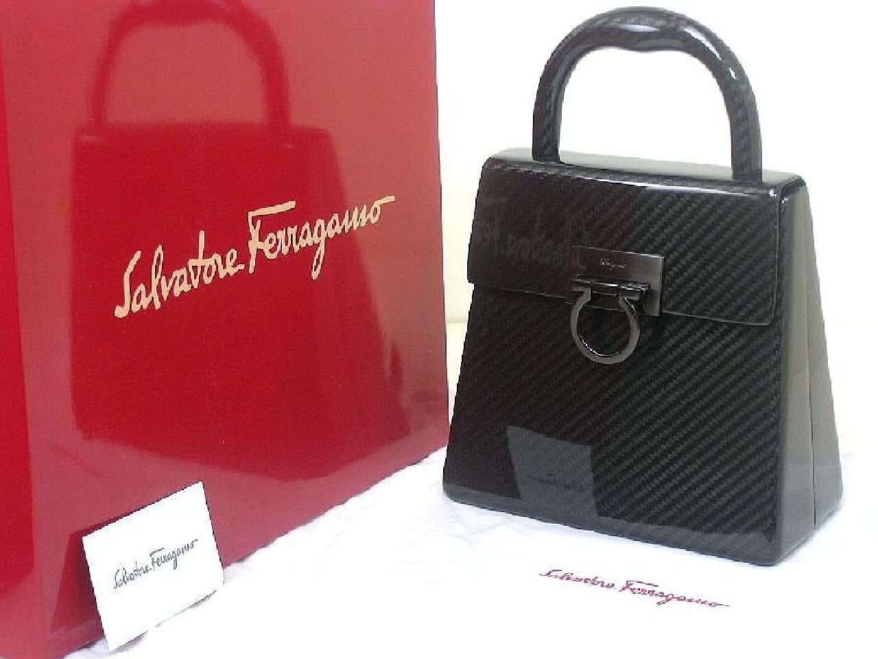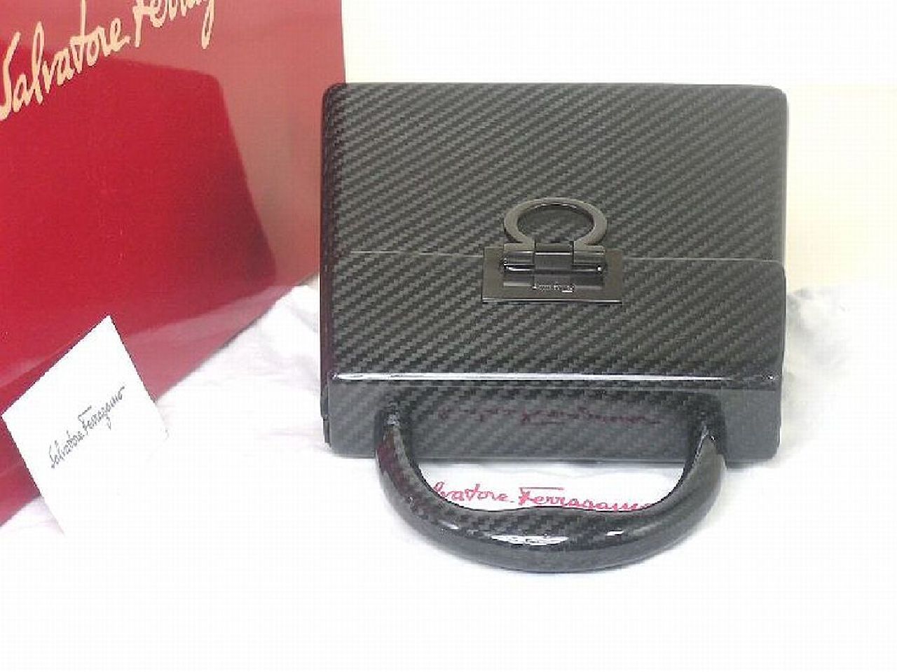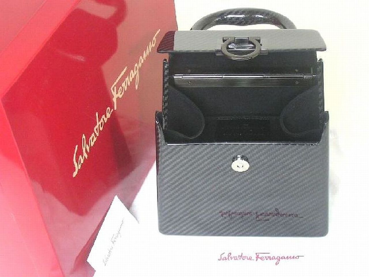 | お立ち寄り 有難う御座います ワンワンです (〇) 初めに 前回 迅速なお取り引き戴いてます皆様は 中ほど 項目 ■ 製品シリーズ・出品 本体・附属品 などに ジャンプ 移動 ください (〇) 改めまして この出品は 落札者様 ヤフオク!にお支払い 商品 受け取り連絡後 商品代金など受取り可能になる出品物です お支払方法 Yahoo!かんたん決済(銀行振込み・クレジットカード・コンビニ払い・PayPay決済など) 落札者様 ヤフオク!にお支払 → 出品者 発送 → 落札者様 受取連絡後 → ヤフオク!へ商品代金など支払申請 落札者様 受け取り連絡されない場合 商品代金など出品者が受け取り出来ますのは 19日後前後で御座います ご入札はご配送先に商品ご到着 その後 2日以内にシステム受取り連絡されます方のみでお願いします もし満たされない場合も出来るだけ私から催促致しませんが新たなお取引き遠慮します事はご了承ください 発送 決済確定日お時間によりまして 当日 又は 翌日 発送させて戴く出品物です 消費税はお預かりできません お支払い かんたん決済 送料と落札額 落札後 購入手続開始・決済完了は 落札日・休祝日を除く 2日以内で御座います こちらを満たされない場合はナビ連絡 その後 落札者様都合の削除します 入札前ご連絡くださいまして予め合意 厳守してくださいます方は ご案内限りではありません (〇) ヤフオク!落札ガイドを1度も既読ご確認されてない場合やヤフオク!初めての方は この文字列クリック ヤフオク!落札ガイド商品ページ確認ポイント 4.※ 他同落札ガイド 03~05 など全般1度はご参照ください (〇) 商品 出品の多くは 世界を代表致します有名ブランド品 綺麗なお品 未使用品 珍しい御品 又 激レア限定未使用品 自身のコレクションに国内直営店にて購入させて戴いた希少限定品も存在 365日湿度管理・完全未展示保管 (〇) 出品 こちらは サルヴァトーレ・フェラガモ カーボンファイバー製 限定ハンドバック 商品説明フォローコメントなど既読ご自身の希望に合っているかを入札前にご確認ご判断してください フォローコメントは この文字列クリック 全出品物ページ1番上に御座います (〇) 他の私の:ID wan_wan_678 を含む 今までに適確な取り引き戴いてます方を除く 日本文章に慣れてない方 (The person who is not used to Japanese, a Japanese sentence) 翻訳ソフトでなく(no translation software)記載商品説明ご案内日本文字文章など日本人同等に理解できる方 又は日本人同等の解釈 助言 又は代筆 代理会話して戴ける方が そばにいらっしゃる環境の方のみでお願いします 上記 環境でない場合 入札避けてください。 (〇) サルヴァトーレ・フェラガモ カーボンファイバー 重量重さ鉄の 1/4、強度は鉄の10倍、非常に軽くて強い 素晴らしい炭素繊維素材 近年の航空機、宇宙航空力学工学、世界のモタースポーツ フォーミラーワン 「F1」、 世界を代表する有名自動車メーカー 高級スポーツカー 名車 高級車に採用されてます 世界を代表するファッション界もこの炭素繊維素材カーボンファイバーを特別なモデルに採用 エルメスでは 乗馬用ヘルメット 限定カーボンファイバー ライディング ジョッキーキャップ そして2種類のエルメス150周年記念 カーボンファイバー 限定アタッシュケース エスパス フェラガモメンズでは 美しい曲線に仕上られた 素晴らしい限定カーボンファイバー アタッシュケース フェラガモレディースでは2種類 限定カーボンファイバーショルダーバックとそしてこのハンドバック 世界を代表する有名ブランドの最上級の特別なモデルに採用されますカーボンファイバー製限定バック 『 サルヴァトーレ・フェラガモ 限定カーボンファイバー ガンチーニ 』 以下通常文です ■ Salvatore Ferragamo ■ ■ ブランド本国・生産国・品名 イタリア フィレンツェ スピーニ フェローニ宮殿 Italia Made in Italy カーボンファイバー製 ハンドバック □ 画像説明 出品 未使用品 ご案内をメインに画像を拡大 その後縮小 現実サイズでご覧ください 綿手袋使用 お写真では白い糸又点の繊維など付いて写ってる場合が多々御座います □ 記載説明 正確な記載ご案内に努めてますが 全ての方にご満足戴くのは不可能と思います 不明重要な点は 項目 (◆) ご覧くださいまして入札前にご質問ください その他 出品者情報など全般をご覧くださいまして総合でご判断をお願いします ■ 製品シリーズ・出品 本体・附属品 サルヴァトーレ・フェラガモ 限定カーボンファイバー ハンドバッグ 未使用品 附属品、 Salvatore Ferragamo 純正箱BOX / 純正保管用布袋 / フェラガモ製品タグ / (上記 カーボンファイバー制 ハンドバッグ 激レア未使用品 本体・附属品) (保存袋は布製少しの毛玉はあると思います) (箱は厚紙製傷すり傷など傷みから逃れるのは不可能です予め配送用又は保管用とお考えお願いします) (外箱) 箱は厚紙製角が弱く配送用又は保管用などと記載させて戴いてますが 配送中保障対象と思いますもしもの時は配送会社様にご相談ください (梱包) 完