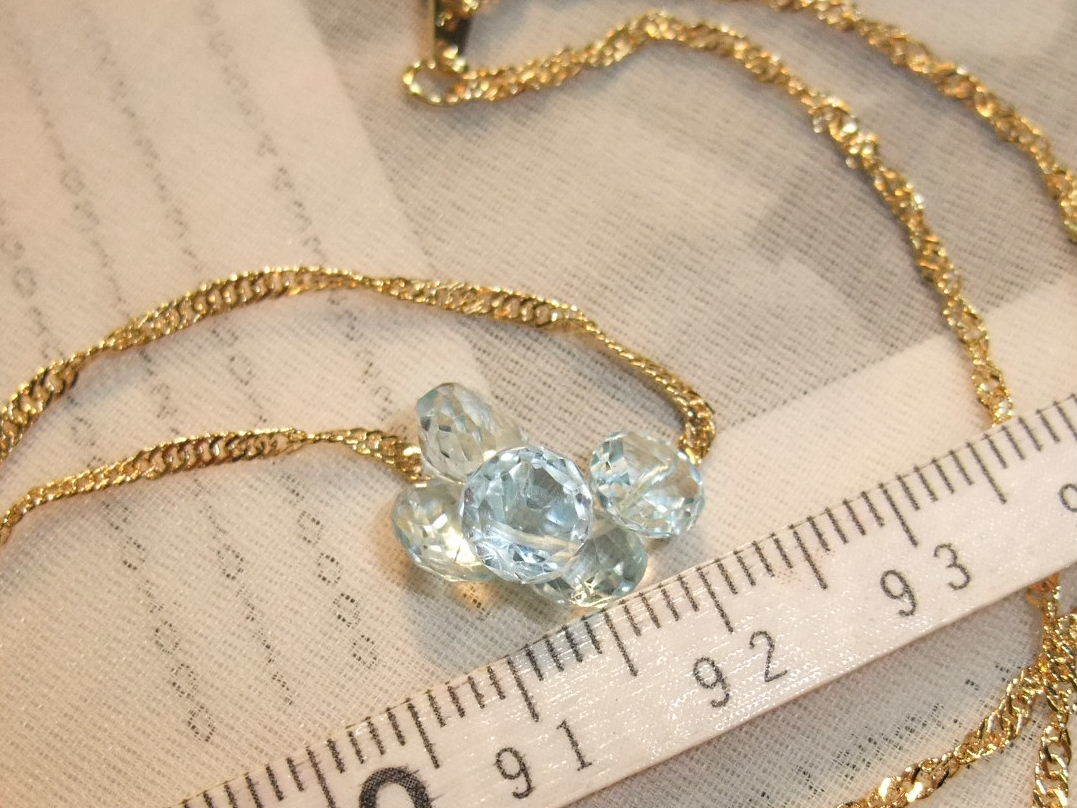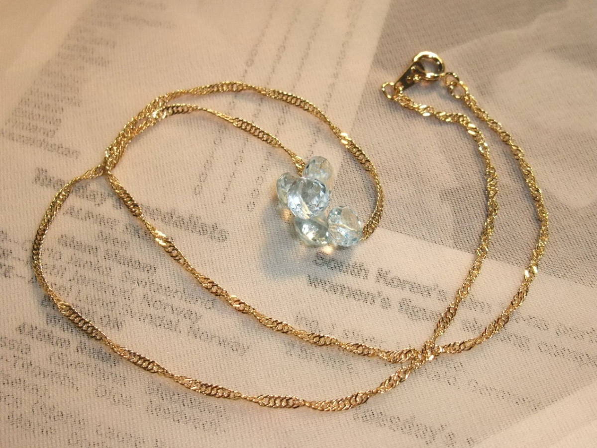 ブルートパーズの石質はとても良くお色もきれいな水色です♪カットは丁寧なファセットカットで美しいルースで、古いものですが高品質な国産の真鍮のチェーン(金鍍金)と、まずまず良い品質の留め具を付け、ネックレス(約40cmちょっと越え)に仕立てた製品です♪(留め具はまずまず品質良いですが長い間倉庫に保管してあったので、動きが悪いときは2,3度軽く開け閉めを繰り返してからスムースになってからご使用ください。)