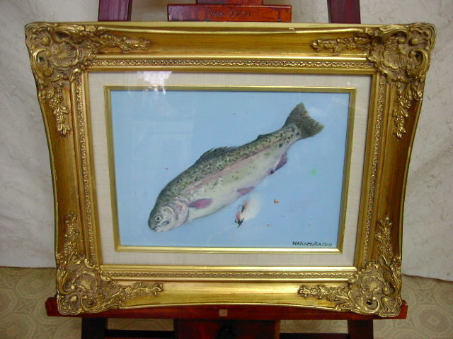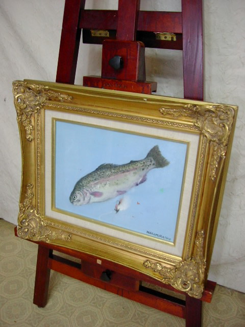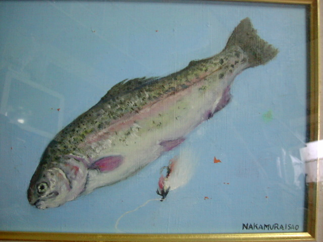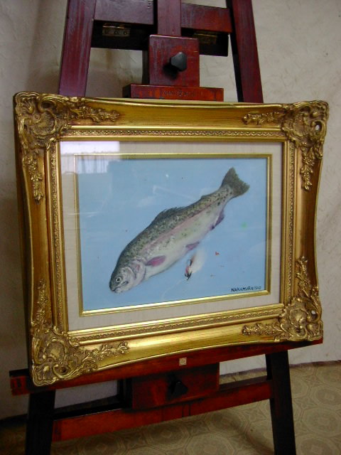 商品説明 ・・・   チャーチル会会員、地元 ローカル画家力作の油彩画「ニジマス ( 真作油絵 )」です。キャンバスのサイズは「33,3×24,0 cm F4号画」と成っています。又、額縁の大きさ・等は「W : 50cm  H : 41cm  D : 8,5cm のガラス張り・金額縁」と成っています。―― 作画者人物紹介 : 中村 ( 北海道 十勝地方在住・若き頃 : 当時 全国12を誇る「美晴久平写真館」に弟子入りし、その後「宮内庁」から写真担当の勧誘されるも 諸事情から断念・定年後 : 全国組織で有る「チャーチル会」に入会し、精力的な絵画活動を行い 全国大会に於いては その度毎に多々の入選作を受賞する・享年 95 ) 、画法は 写実・マチエルを得意とするローカル画家 ―― で有りました ・・。