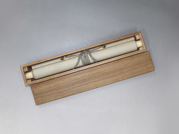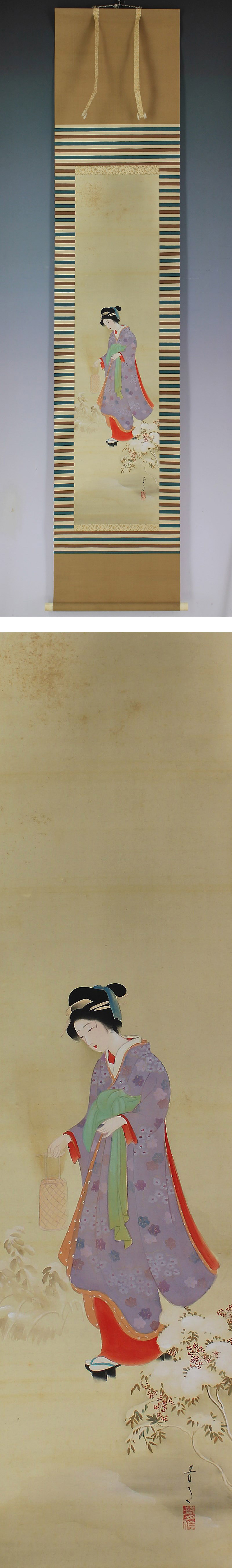 横尾芳月 よこお-ほうげつ (1897-1990) 大正-昭和時代の日本画家。 明治30年1月9日生まれ。池田輝方,蔦谷竜岬(つたや-りゅうこう)にまなぶ。大正15年帝展に「和蘭陀土産(オランダみやげ)」が初入選し,以後帝展,新文展,日展を中心に活躍。また昭和10年伊東深水に師事し,青衿会,日月社などでも活動した。平成2年2月3日死去。93歳。福岡県出身。本名は徳次郎。 本紙は、時代感、シミ、汚れがあります。 表装は、かるいシミ、かるいヤケがあります。 【サイズ】 作品 横約26.5cm×縦約110cm 表装 横約39.5cm×縦約190cm |