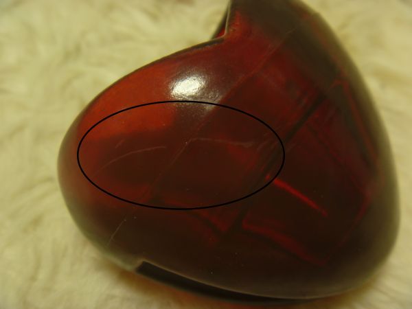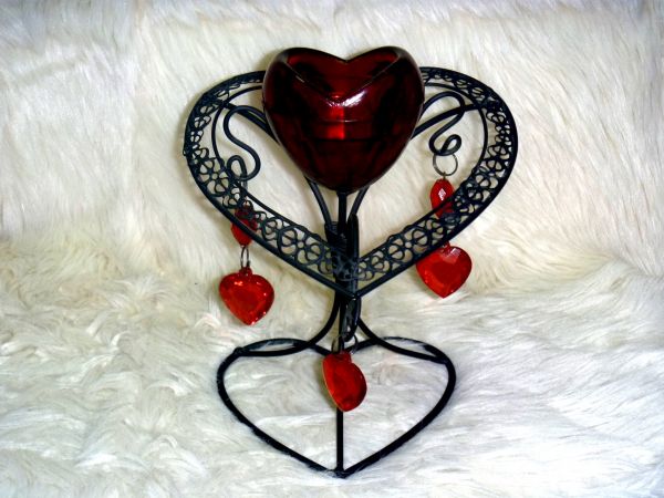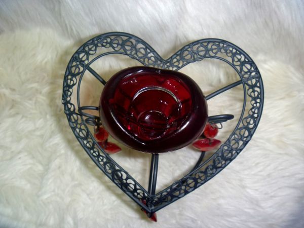 高さ約18cmです。大きなハート(ガラス)横約6,8cm(長いところ)、宝石風パーツ(アクリル製?)は初期からの接合ムラ、若干のスレ、スリキズあり。ガラスのハート裏面画像の○のようなキズあり。ガラスのハート明るいところでみると若干のスレあり。全体に見て、手にとって見ると分かる程度の使用感と思います。置いて飾るにはあまり気にならない状態と思います。ガラスのハートのキャンドルを置くところ、よこ約3cm、奥行き約3.7cmです。
