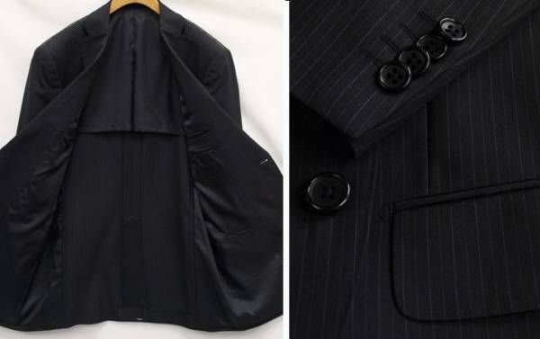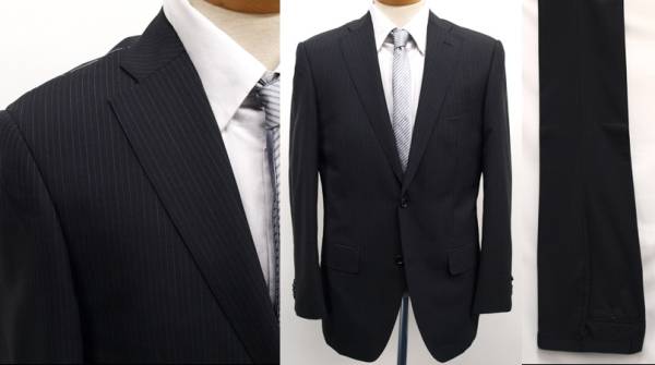 ☆デザイン☆ ジャケット・シングル2つボタン/ノッチドラペル/背抜き(春夏物)/センターベント パンツ・ノータックパンツ 細身ではなくほどよいゆとりのあるベーシックなレギュラータイプのシングル2つボタンビジネススーツです。 ジャケットはスリムタイプと比べると、ほどくゆとりのあるシングル2つボタン。 パンツはウエストラインではくタイプで股上が浅くなく、2タックほど太くなく、かといって細身ではなく、おなかまわりがすっきりと見えるほどよいゆとりがあるノータックパンツです。 ☆縫製仕様☆ ジャケット/ノッチドラペル/襟元などにAMFステッチ入り・切台場・袖口ボタン4つ・センターベント・背抜き パンツ/ノータック・ヒザ裏付き・ヒップポケット両玉縁で左のみボタン付き・脇ポケット縦付け・前ファスナーでボタンとホック留め・内掛け釦あり 新品・裾上げ未処理 | ||||||