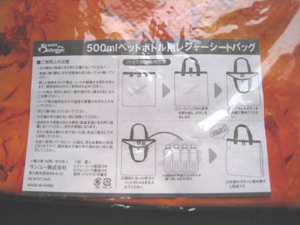 | 「午後の紅茶」の500mlペットボトル用レジャーシートバッグ。レジャーシートにもバッグにも使える優れもの。キリンオリジナルの非売品。バッグ時の大きさは横29×縦30cmで、500ml角型ペットボトルが4本並べて入れられる大きさ。レジャーシート時の大きさ60×84cm。材質は表面がポリプロピレン、裏面がポリエチレン。送料は、宅配便サイズ80、重さ110g。 |