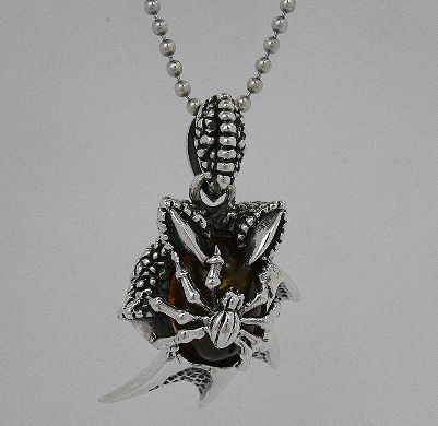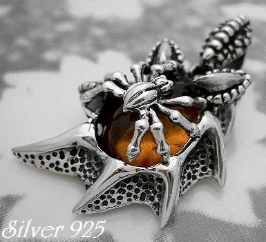 シルバー925銀の天然石アンバー琥珀入りスパイダー蜘蛛ペンダント/Bu-boon silver