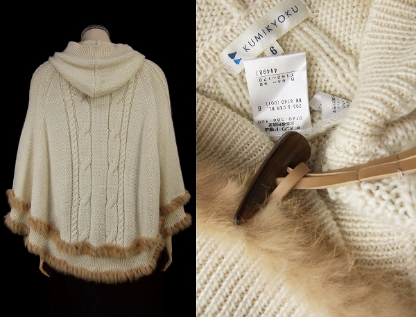 ![]() ![]() 落札後はオークション終了のお知らせメールに出品者からのメッセージが御座います。 自己紹介欄には急な休み等の記載をする場合が御座いますので一度お目通し頂きます様お願いいたします。ご一読の上オークション終了後2日以内の連絡、 落札後4日以内のご入金のお約束を守って頂ける方のご入札をお待ちしております。 小さい子供がおりますのでお急ぎのお取引を希望される方のご入札は遠慮下さいませ。 ---↓ここにブランド名記入---- ブランド名:KUMIKYOKU 組曲 (株)オンワード樫山 ---↓ここに特徴記入---- 特徴:暖かく優雅なたっぷりポンチョです。エクルベージュ系のアルパカ&モヘア混はとても滑らかで暖かい綺麗織り!滑らかラビットファーが優雅な装いのしなやかポンチョです。 ---↓ここにサイズ記入---- サイズ : 6 表示(トルソーは9号です) 実寸(平置き採寸) 裄丈67cm、着丈73cm、裾幅105cm、合わせ部4つボタン、1つトグル留 ---↓ここに素材記入---- 素材 : アクリル50% 羊毛20% アルパカ20% モヘア10% 毛皮部分ラビット テープ部分 合成皮革