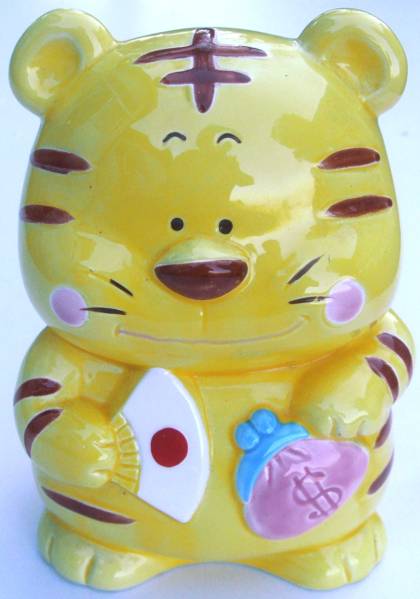 日本の扇子&がま口を持ったトラの貯金箱です。