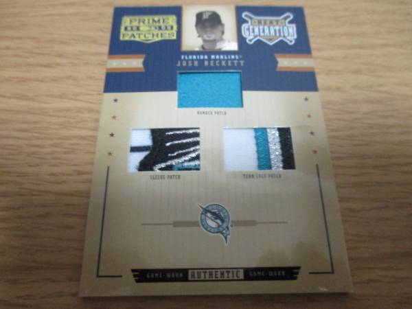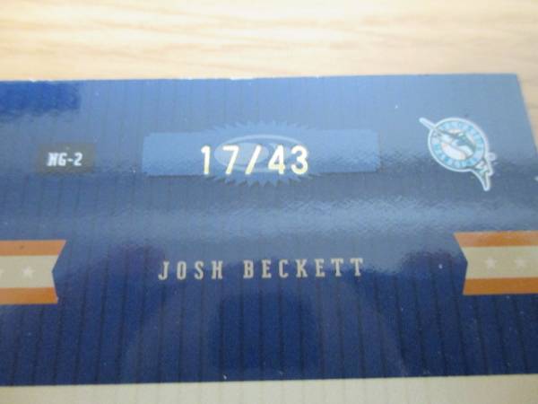 JOSH BECKETTがフロリダマーリンズ所属時代に実際のゲームで使用したユニホームの背番号部分&チームロゴ部分&そでのマーク部分の3か所のパッチ部分の各一部がインサートされたレアなカードです。シリアルナンバー17/43です。