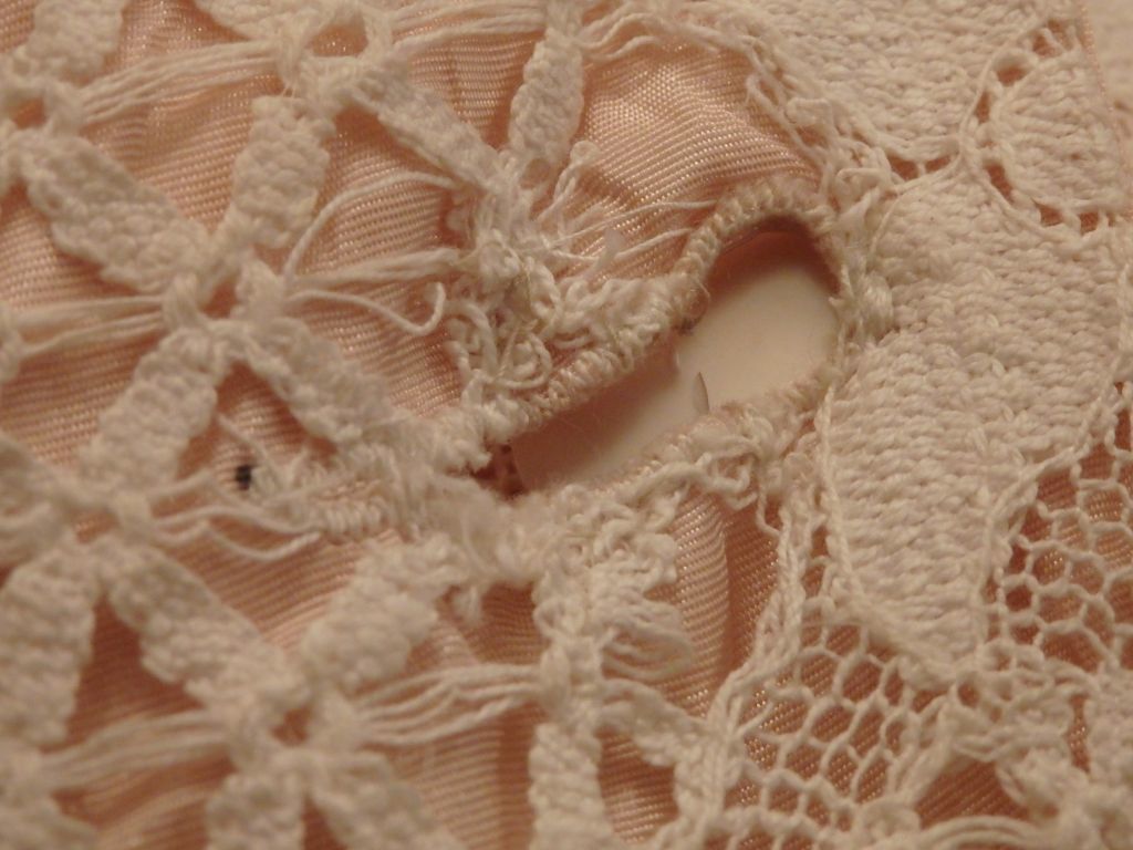 ボタンホール周辺にリペアやレース糸の切れがあります