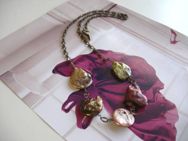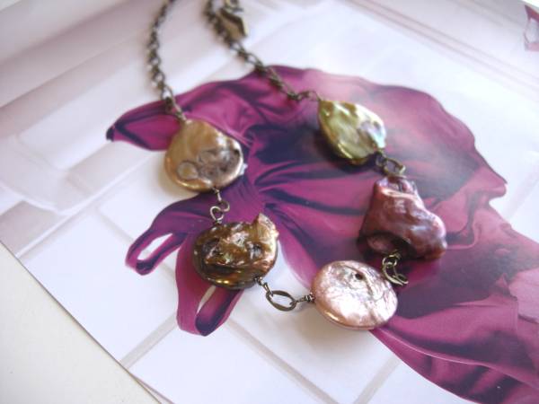 ルーズ・シルエット・・シリーズです♪バロック・パールに恋して・・個性的なバロックの淡水パールのネックレスです♪存在感のあるパール なのでシンプルなデザインに仕立てました♪♪20ミリから25ミリ位までのコインや楕円形のバロックの淡水パールです♪デザイン チェーンを合わせてシックな表情です♪長さは62センチ位で調節自由です♪お揃いのシリーズも出品しています♪ハンドメイドを ご理解頂いてノークレーム、ノーリターンでお願いします