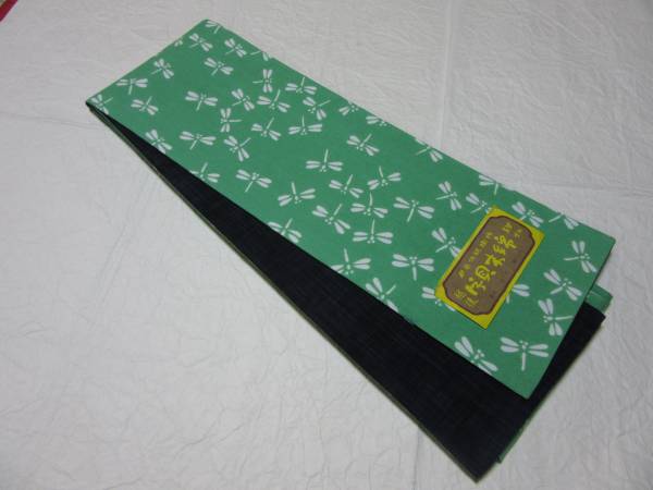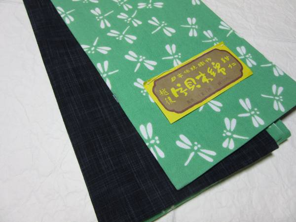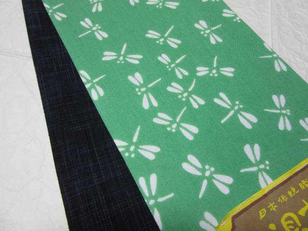 遊び心いっぱいのおしゃれな半幅帯です。グリーン地にとんぼの柄、紬のおしゃれ着から浴衣までご利用くださいませ。