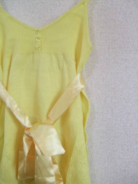 | 商品紹介 | 黄色の透かし編みがオシャレなキャミソールニットです。 ウエストのサテン地のリボンがポイントになっています。 胸元はリブ素材で、クリスタル風の透明なボタンが付いています。 《素材》 綿45% アクリル45% ナイロン10% |