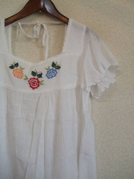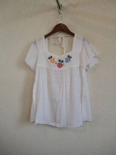 商品紹介 | 胸の花の刺繍がオシャレな半袖ブラウスです。 シワ加工が施された白のシングルガーゼ素材で着やすいです。 花の部分は薄いオレンジ、赤、青、葉の部分は緑、黄緑、マスタードイエローで 刺繍がされています。 ※薄手で透け感があります。 《素材》 綿100% |