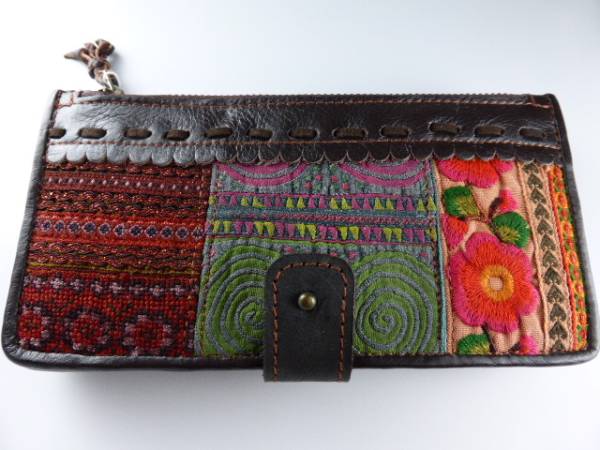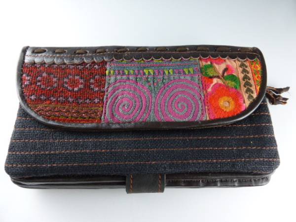 タイ北部の少数民族、黒モン族の古い刺繍とレザーを使って作られた長財布です