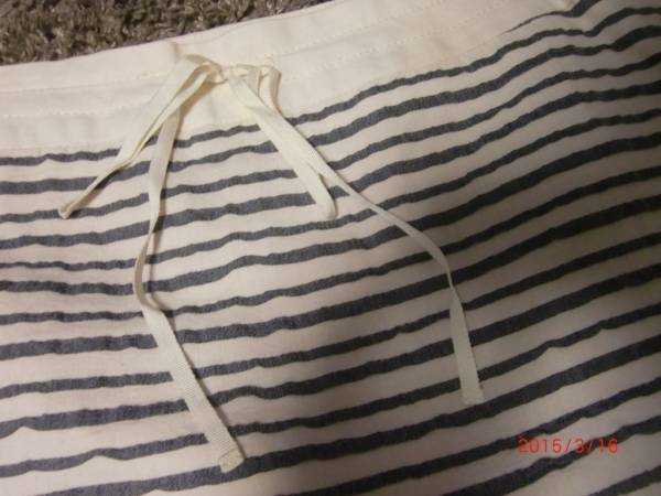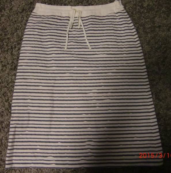 アイボリーとグレーのボーダースカートです。ボーダーは模様ではなく、ちゃんと生地が重なっていてさわやかでおしゃれな感じですよ。お色も優しい色合わせで上品でかわいいイメージです。きれいめにデートやオフィスでジャケットに合わせても。合わせやすく気に入っていましたが、体型が変わってしまい入りませんのでどなたか気に入って下さった方にお譲りできたら嬉しいです。サイズ表記は38、ウエスト幅35cm、着丈62cmです。素材は綿75%、ポリエステル25%、裏地ポリエステル100%です。サイドファスナー開閉。ウエスト紐で若干のウエスト調節可能。