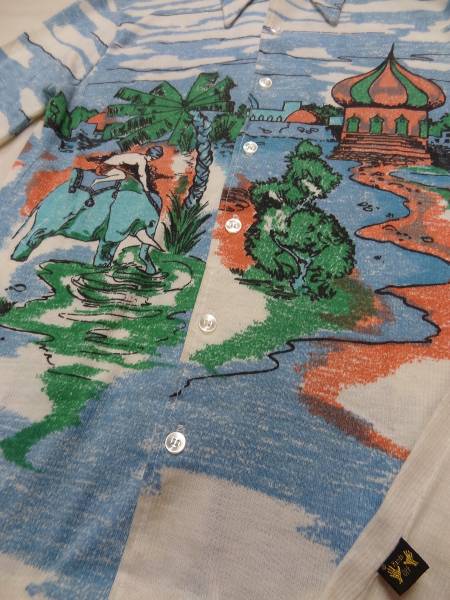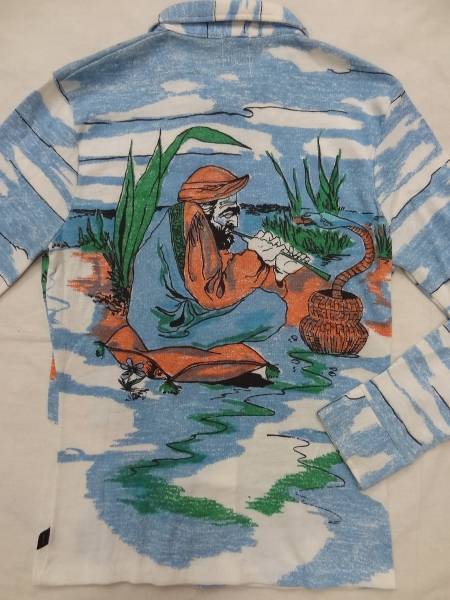 ビンテージ HANDS OFF ハンズオフ 希少 70S 中東 蛇 ヘビ 使い 人 総柄 両面 プリント 綿 ポリエステル リブ 織り シャツ レア 珍品 アラブ