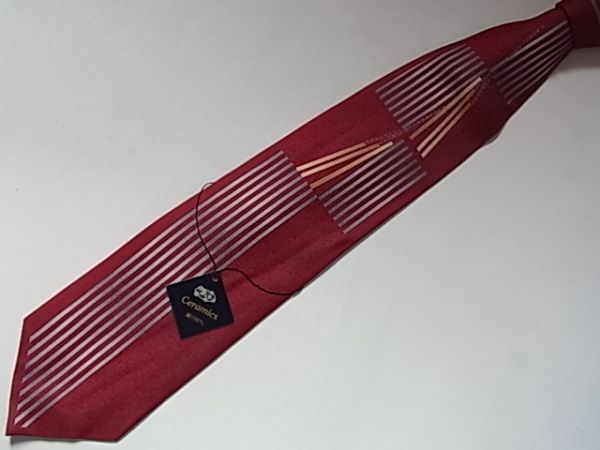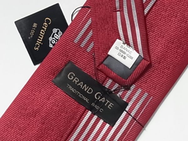 未使用品です。GRAND GATEネクタイです。素材はシルク(絹)100%。大剣最大幅約9.5cm。日本製。縦縞柄。ベース色は赤色レッド系。光沢があります。