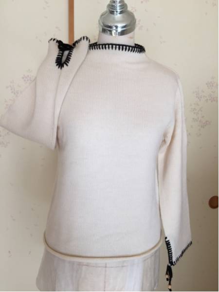 衿と袖口に黒の毛糸でボタンホールステッチが入っています。衿はローハイネックになっています。材質毛50%アクリル50% サイズ着丈50身幅45ゆき61です。