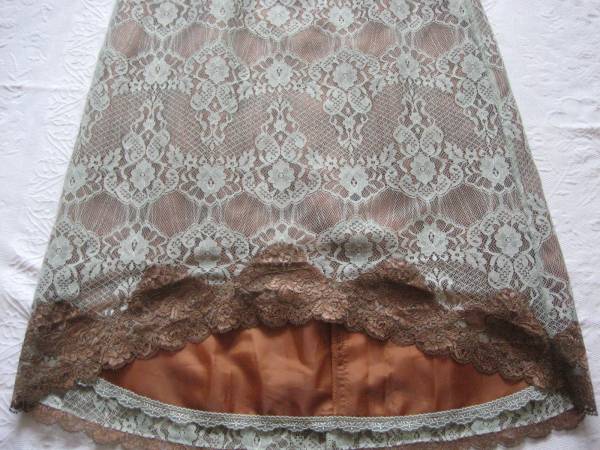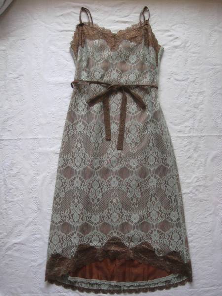 ライトグリーン系のレースにブラウンの裏地やリボンが上品で可愛らしいワンピースです。