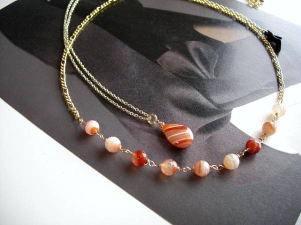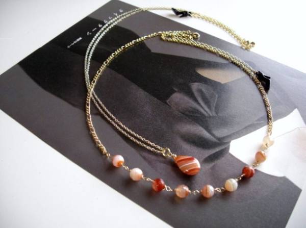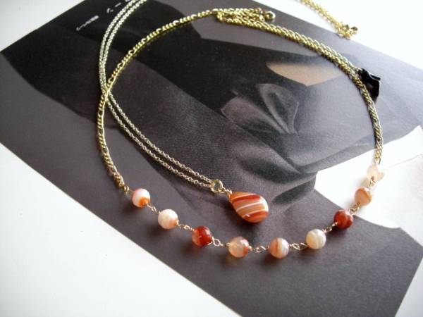 ずっとお気に入り・・シリーズです♪初夏のカーネリアン・・シックなカーネリアンのネックレス2点セットです♪ふんわりやさしい色合 いとストライプ模 様がキュートなカーネリアンが可憐な表情です♪単品でも重ねても楽しんでいただけます♪8ミリのラウンドカットのカーネリアンはデザインチェーンを合わせ ました♪長さは全長68センチ位で調節自由です♪18×13ミリ位のフラットドロップのカーネリ アンは華奢なチェーンを合わせました♪長さは75センチ+アジャスター10センチで最長85センチ位です♪単品やブレスレットや3点セットも出品しています♪シンプルで 飽きのこ ないいつまでも着けられるデザインを考えて作りました!ハンドメイドをご理解頂いてノークレーム、ノーリターンでお願いします